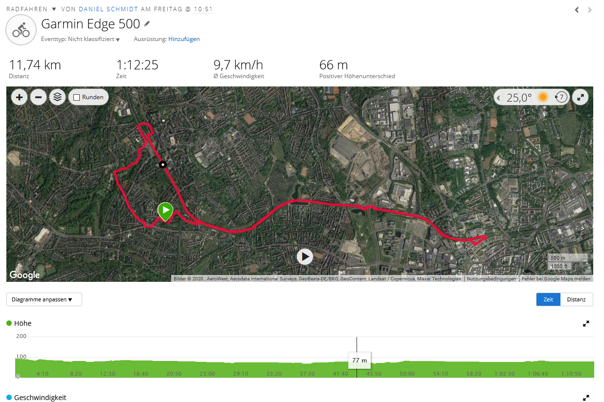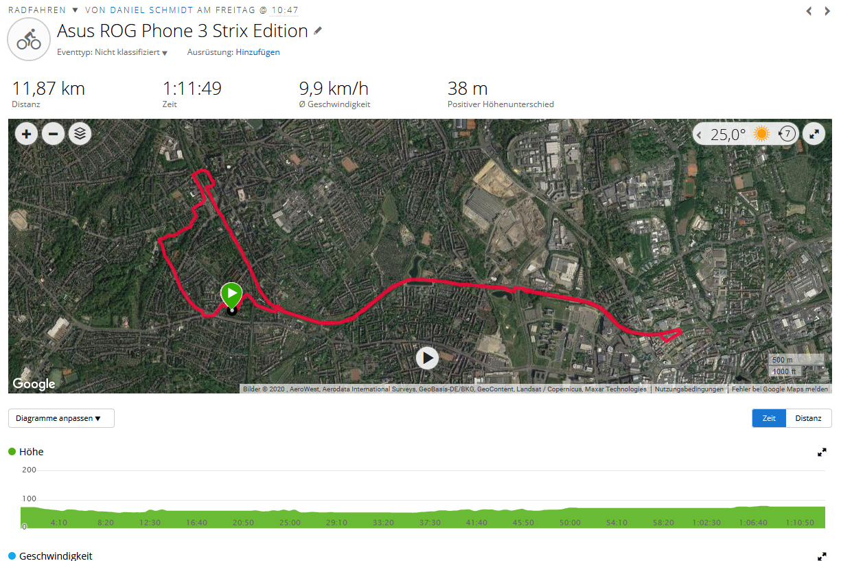 Auf einer kleinen Rundfahrt lassen wir das Smartphone gegen das Garmin Edge 500 antreten. Die Unterschiede der beiden Geräte belaufen sich auf der fast zwölf Kilometer langen Strecke gerade mal auf 60 Meter. Im Bereich des Wendepunktes ist das ROG Phone sogar genauer als der Fahrradcomputer und liegt sonst auf einem ähnlichen Niveau.