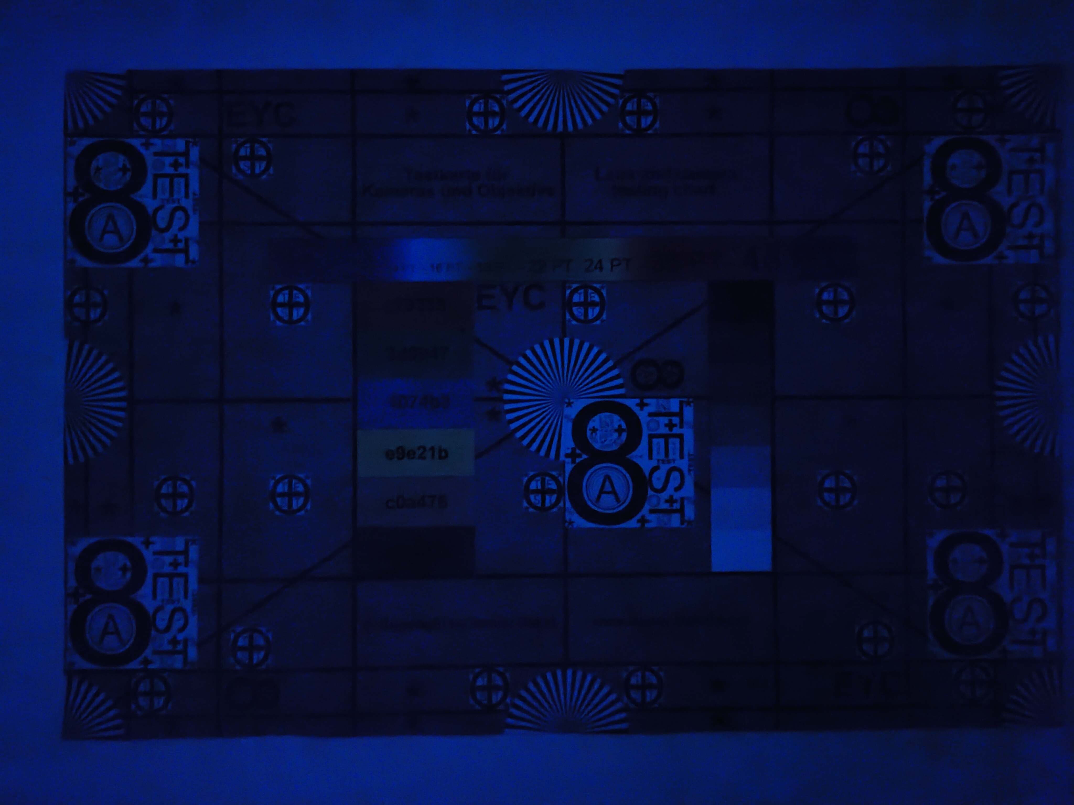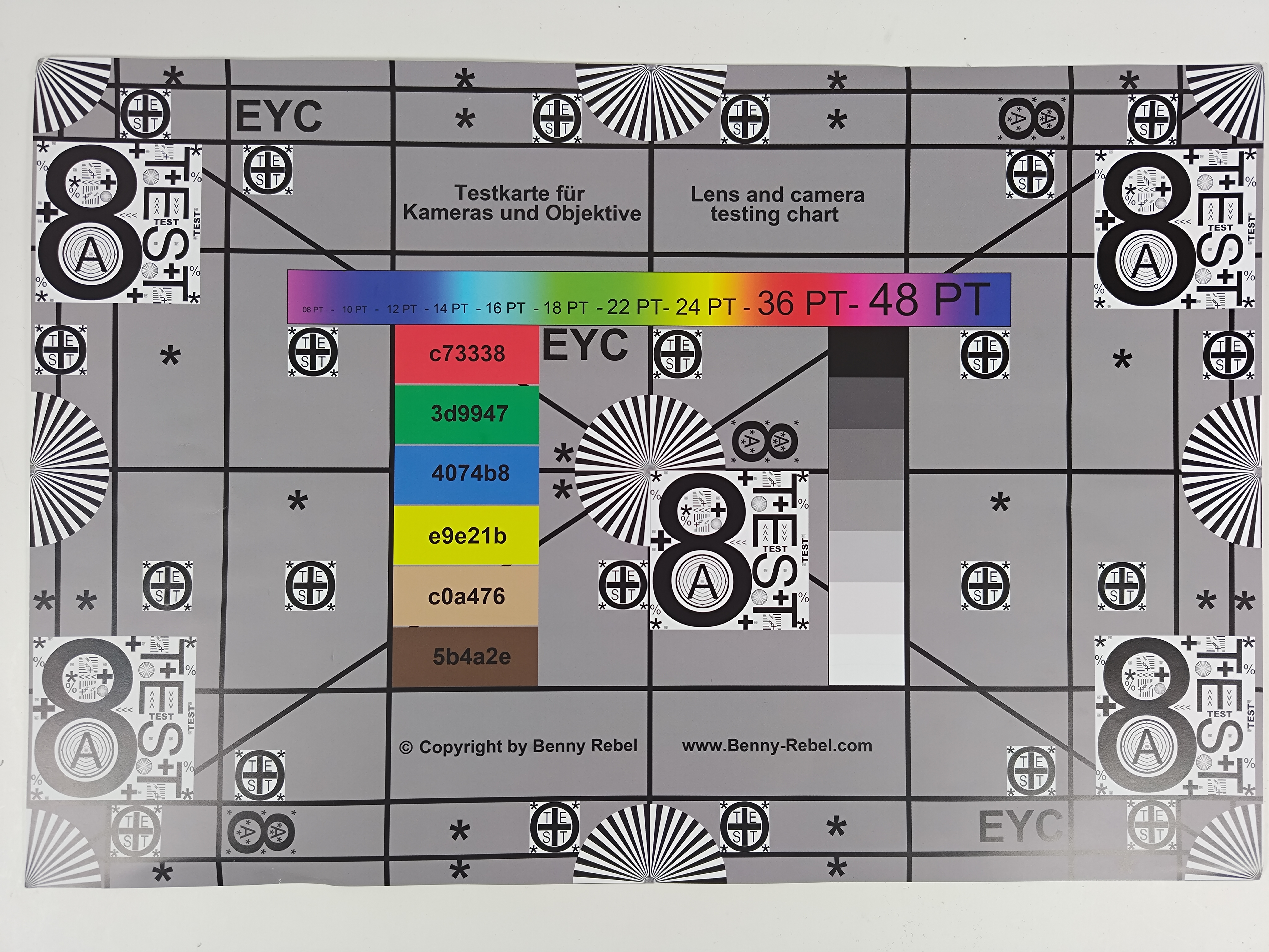 Tageslicht-Aufnahme 1Tageslicht-Aufnahme 2Ultraweitwinkel5-facher ZoomLowlight-AufnahmeUnter kontrollierten Lichtbedingungen zeigt sich, dass die Hauptkamera Farben sehr präzise ablichten kann, wenn das Umgebungslicht passt. Bei 1 Lux Restlicht sind die Aufnahmen im Fotolabor dagegen blausichtig und der Testchart lässt sich nur noch mit Mühe erkennen.