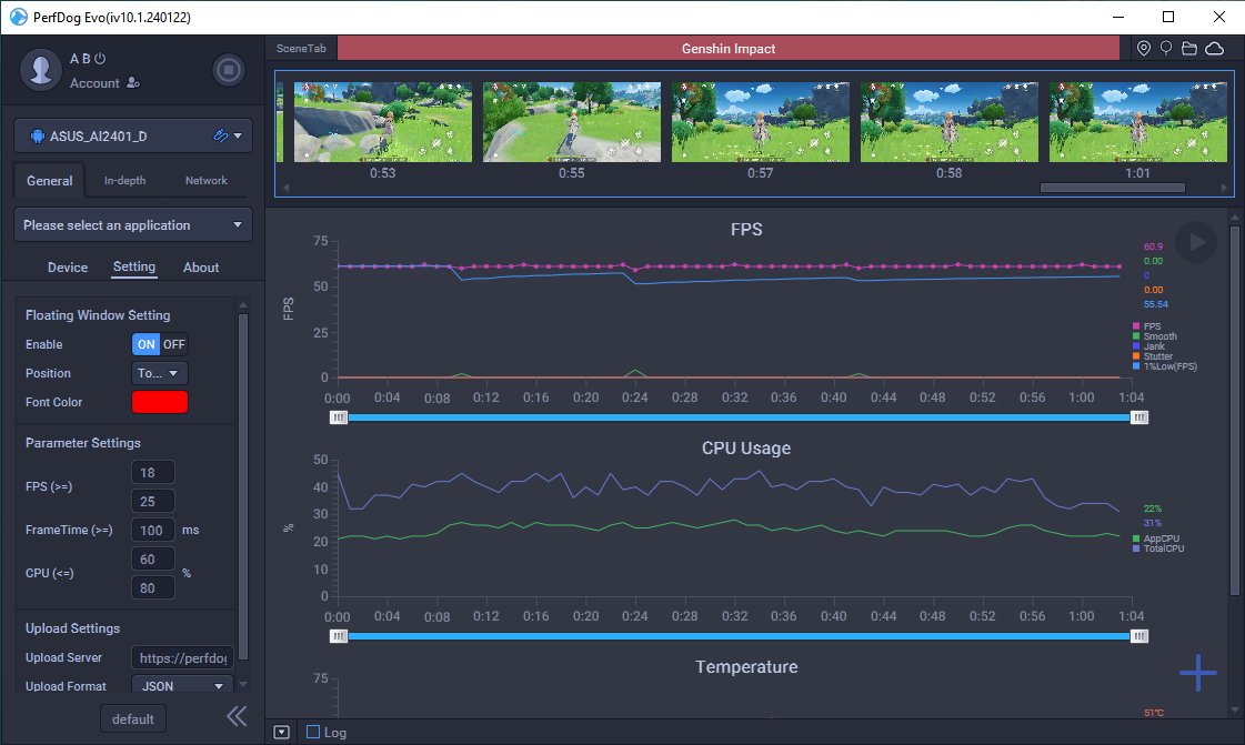 Im Test stellt das ROG Phone 8 Pro Spiele absolut flüssig dar. Auch grafisch sehr anspruchsvolle Titel wie Genshin Impact laufen mit maximalen Settings butterweich über den Bildschirm. Das Asus-Smartphone weigerte sich allerdings, mit unserem Test-Tool Gamebench zusammenzuarbeiten, mit dem wir normalerweise die Frameraten ermitteln. Alternativ haben wir deshalb das Tool Perfdog verwendet.