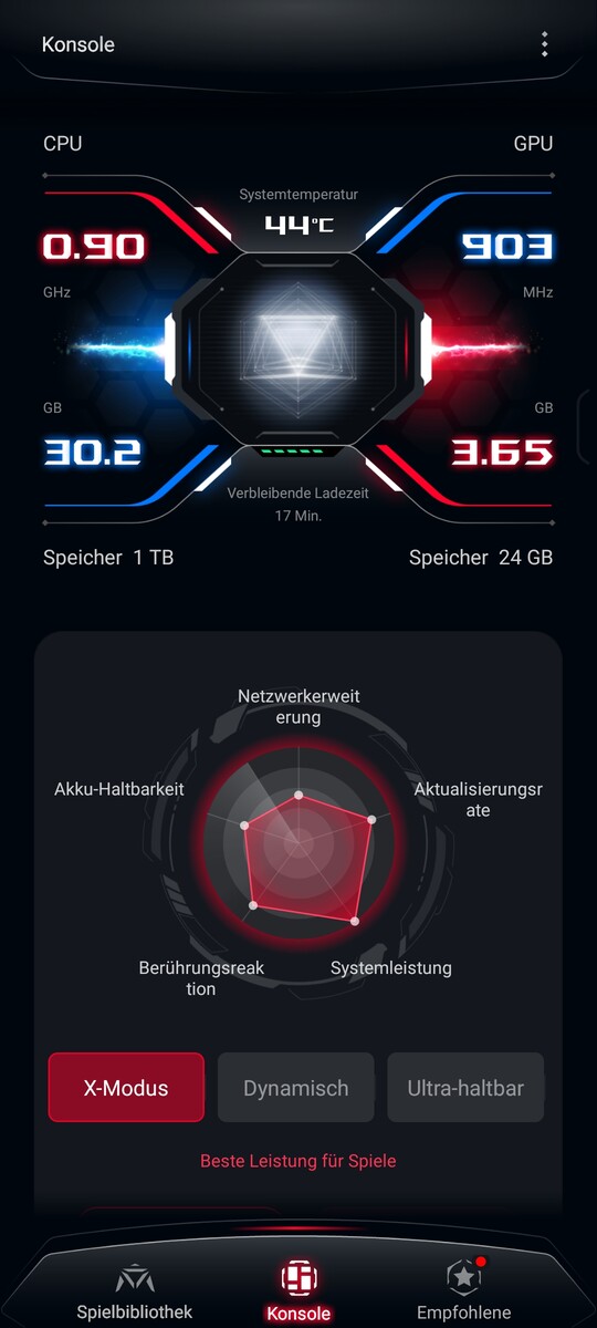 In ROG UI sind einige Gaming-Features integriert. So wird der höchste Performance-Modus X-Modus direkt in der Dachzeile neben der Uhrzeit eingeblendet. Zudem lassen sich mit der App Armory Crate neben den Performance-Modi auch alle wichtigen Smartphone-Komponenten wie die AirTrigger, das Backcover-Display und der externe Lüfter konfigurieren. Und über ein spezielles Overlay kann man die Gaming-Einstellungen direkt während des Spiels optimieren.