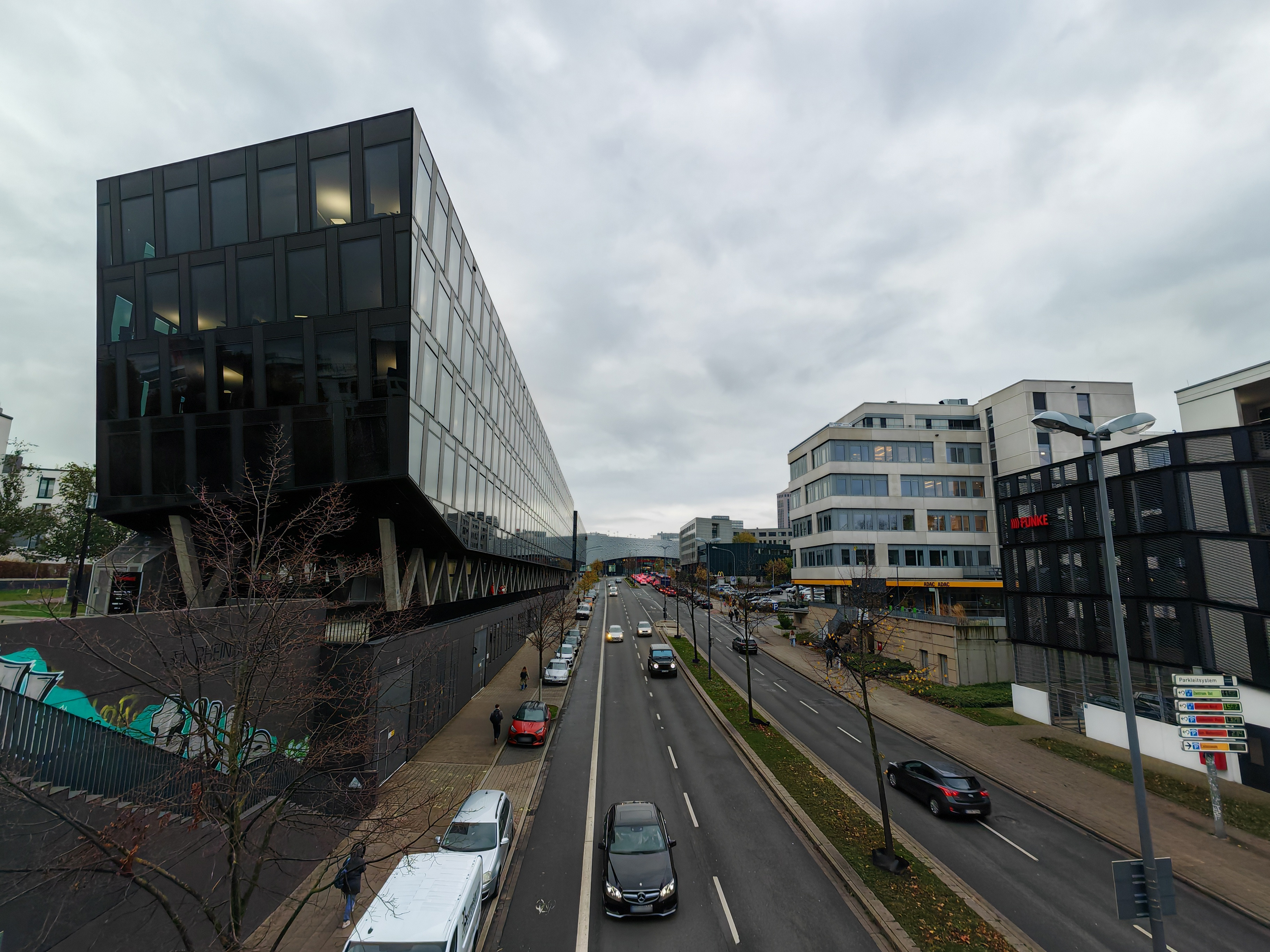 Ergänzt wird das Setup durch einen Ultraweitwinkel, dessen Abbildungsleistung zu den Rändern hin nachlässt und sich dort auch Aberrationen zeigen können. Die Tiefenschärfe geht jedoch in Ordnung. Die dritte Optik im Bunde ist ein dreifacher optischer Zoom (max. 30-fach digital), dessen Sensor jedoch sehr klein ist, da helfen auch die recht vielen Megapixel wenig. Die optische Abbildungsleistung ist bei Tageslicht gut, jedoch bereits ab einer fünffachen Vergrößerung nimmt die Qualität sichtbar ab.
