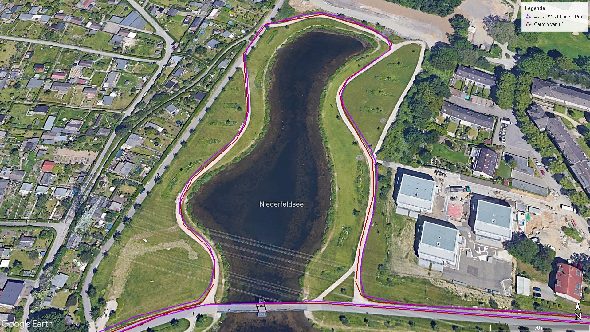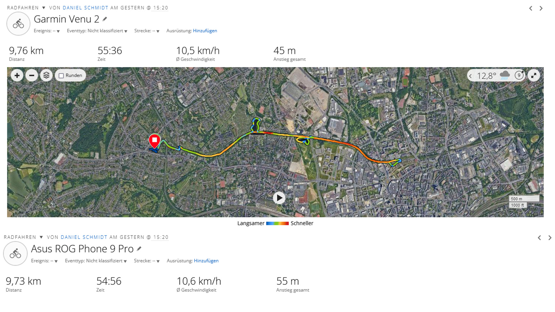 Auf einer Tour mit dem Fahrrad vergleichen wir das Gaming-Smartphone mit der Fitness-Smartwatch Garmin Venu 2. Generell zeigt das Asus-Handy eine gute Wegnachzeichnung und nur im Detail kleine Abweichungen. Im Alltag sind dadurch keine Einschränkungen zu erwarten.