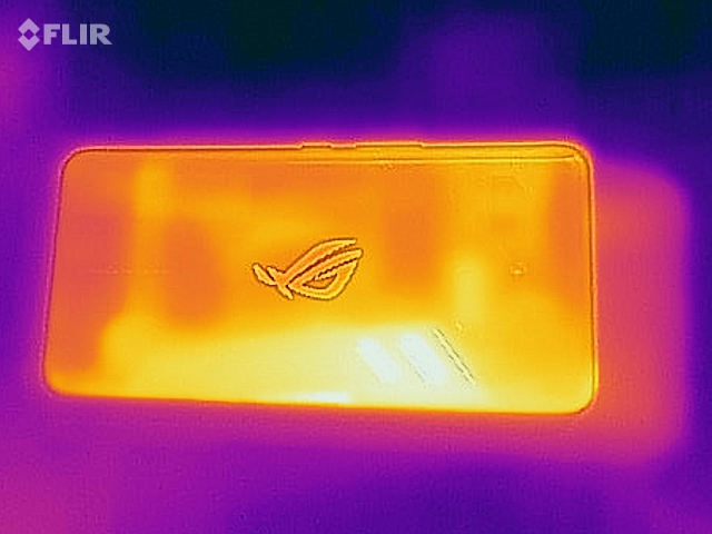Mit dem Fokus auf Mobile Gaming ist zu erwarten, dass der Prozessor stark gefordert wird. Asus integriert daher ein Vapor-Chamber-Kühlsystem im Gehäuse. Das geschlossene Kühlsystem in Sandwich-Bauweise besteht aus Dampfkammern mit Leiterplatte und Kupfer-Wärmeverteiler. Darüber soll ein Kohlekühlpad den Wirkungsgrad bei Wärmeleitung und Diffusion erhöhen. Das scheint auch hinzuhauen: Sieht man sich das Diagramm des GFX-Akkustests an, fällt auf, dass die Leistungskurve, die in der Regel nach hinten raus abfällt, im Falle des Asus ROG noch eine Steigung zulässt. Die maximale Erwärmung haben wir auf der Rückseite mit 45 °C gemessen. Das ist einerseits nicht wenig, andererseits aber noch völlig unkritisch.