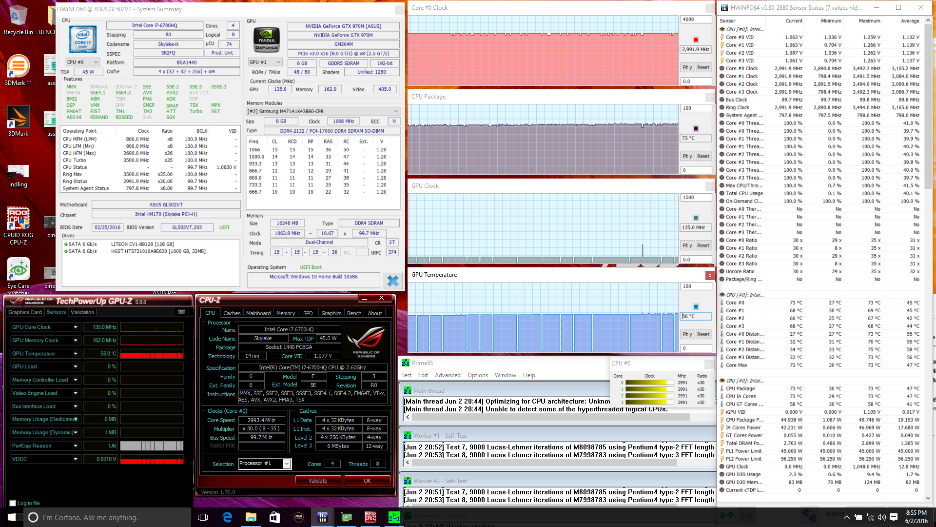 Das sehr dünne Asus G501 mit der GTX 960M konnte im Stresstest nicht überzeugen, aber das GL502 zeigt eine deutlich bessere Leistung. Die CPU kann einen Turbo Boost von 3,0 GHz bei Prime95 aufrechterhalten und liegt damit nur 100 MHz unter dem spezifizierten Maximaltakt für den Core i7-6700HQ. Bei der gleichzeitigen Belastung durch Prime95 und FurMark fällt der Turbo Boost aber weg und der Prozessor arbeitet konstant mit dem Basistakt von 2,6 GHz. Interessanterweise variieren sowohl die Temperaturen als auch die Lüftergeschwindigkeit, bei extremer Belastung sind die Geräuschkulisse und auch die Kerntemperaturen also nicht konstant. Auch die GPU variiert zwischen 300 und 810 MHz, was recht ungewöhnlich ist. Allerdings sind diese synthetischen Benchmarks nicht repräsentativ für die Belastung beim Spielen.