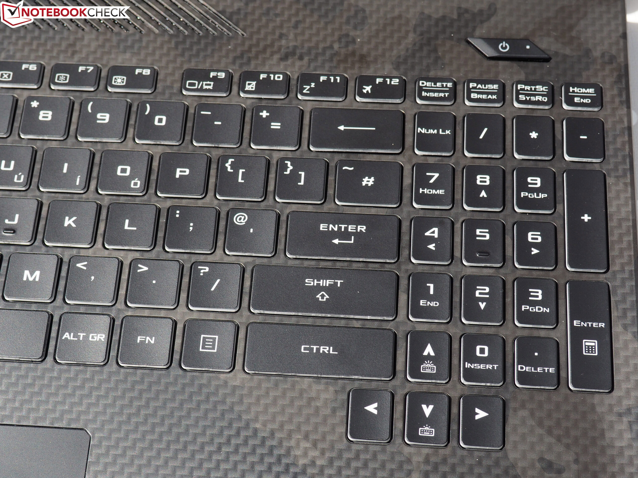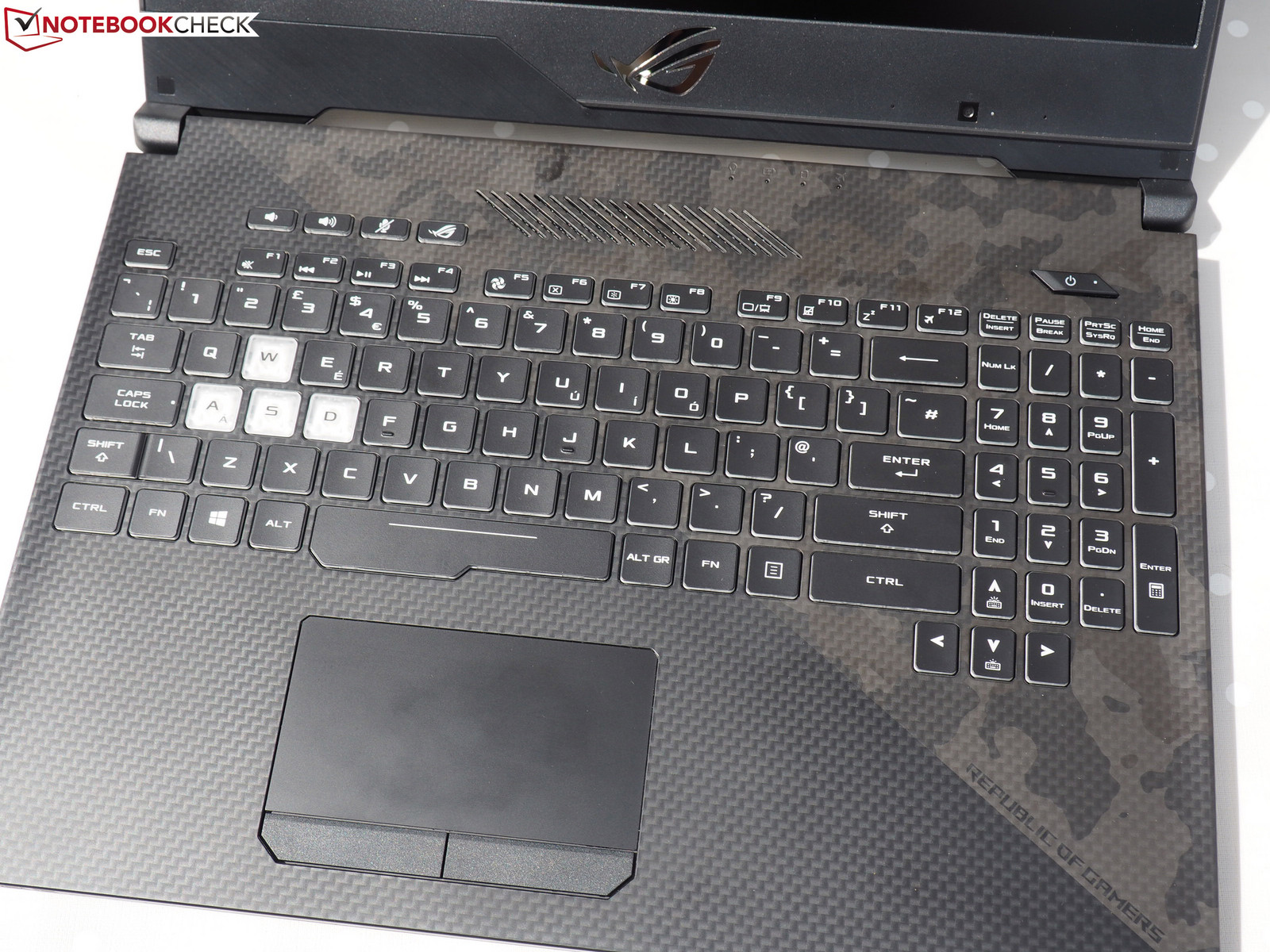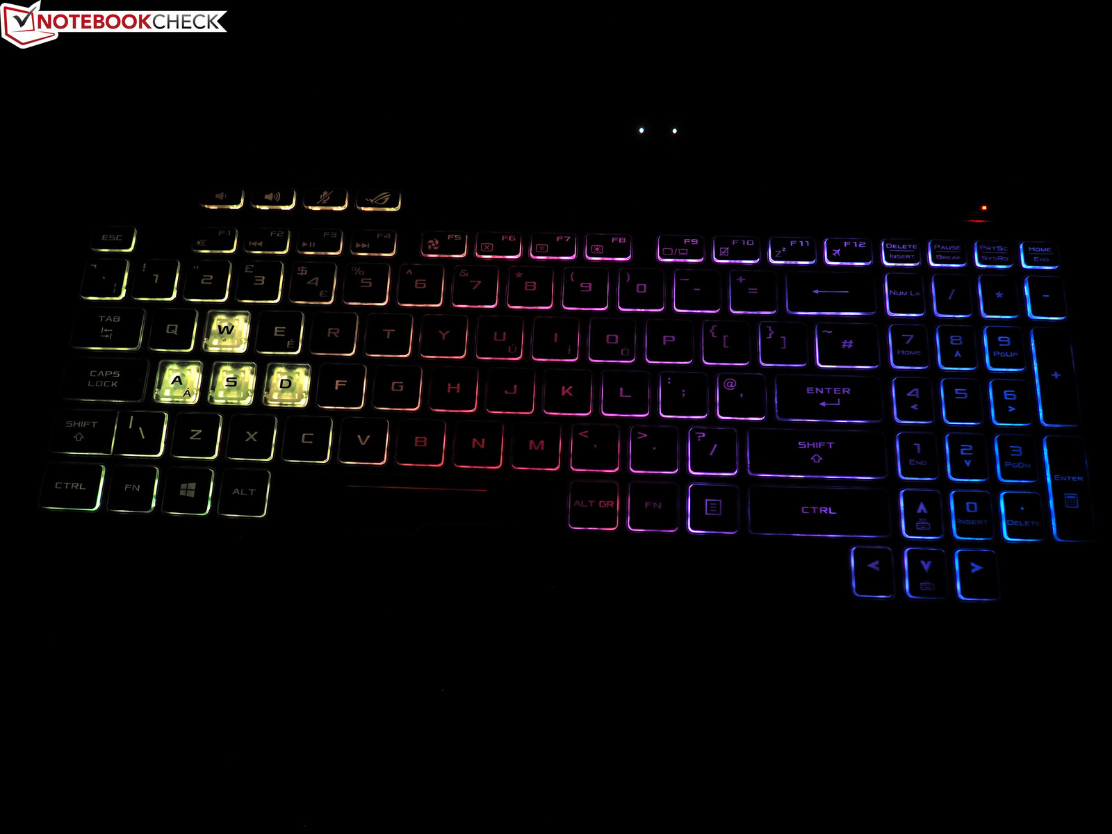 Die Eingabegeräte müssen sich absolut nicht hinter der Konkurrenz verstecken. Im Gegensatz zu anderen Asus Laptops, deren Keyboards etwas schwammig sind (man vergleiche z. B. das G752), fühlt sich die Tastatur beim ROG Strix recht knackig und fest an, was eine hohe Genauigkeit garantiert. Ob man den durchsichtigen WASD-Bereich zu schätzen weiß, hängt vom persönlichen Geschmack ab. Dank der hellen Beschriftung und der konfigurierbaren RGB-Beleuchtung sticht das Keyboard sowieso gut hervor – sei es nun tagsüber oder nachts.