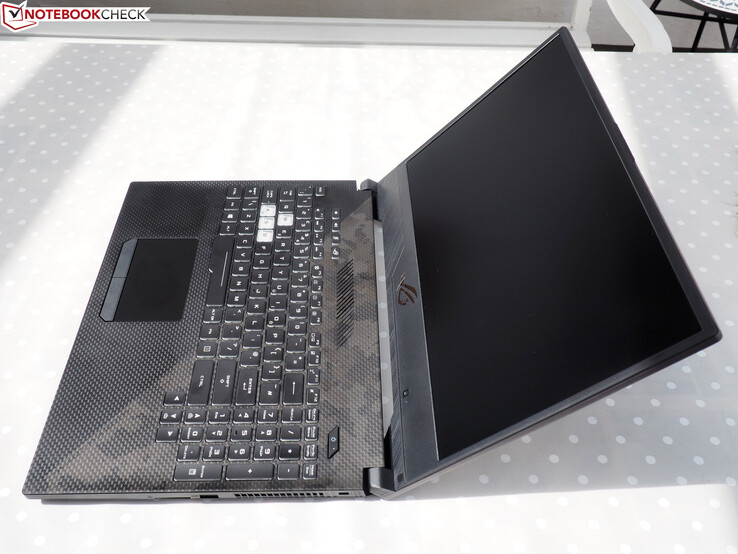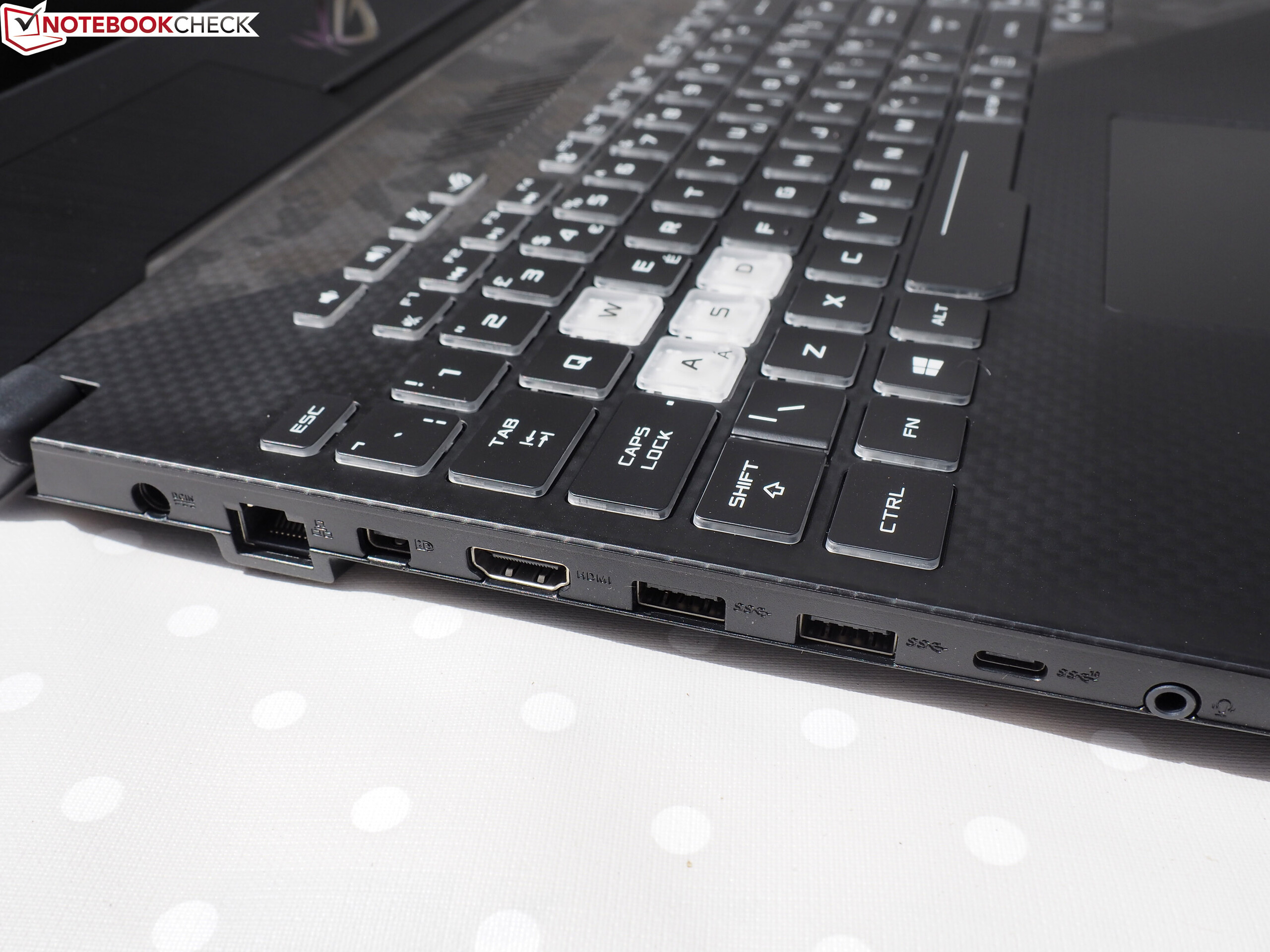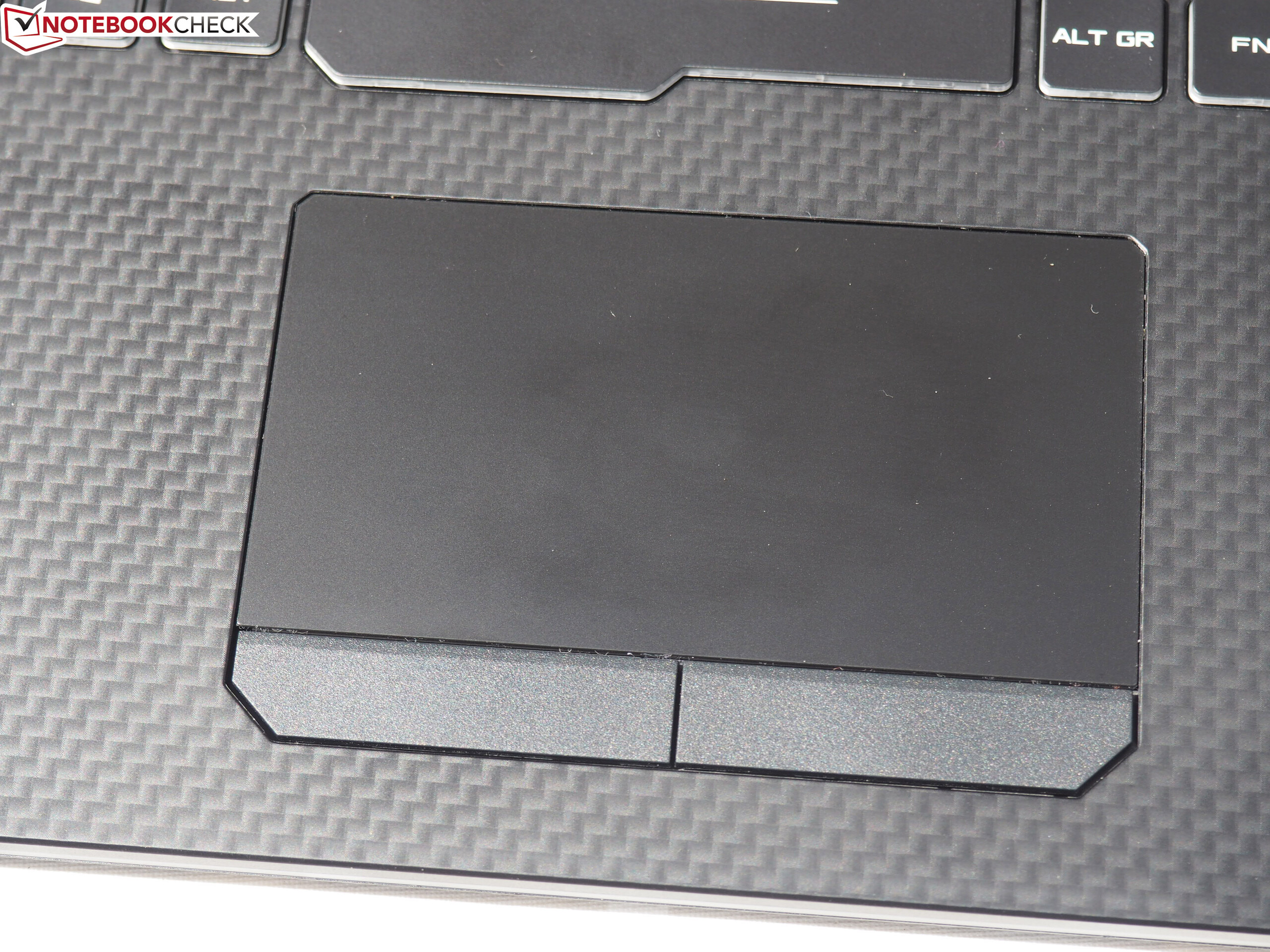 Die Eingabegeräte müssen sich absolut nicht hinter der Konkurrenz verstecken. Im Gegensatz zu anderen Asus Laptops, deren Keyboards etwas schwammig sind (man vergleiche z. B. das G752), fühlt sich die Tastatur beim ROG Strix recht knackig und fest an, was eine hohe Genauigkeit garantiert. Ob man den durchsichtigen WASD-Bereich zu schätzen weiß, hängt vom persönlichen Geschmack ab. Dank der hellen Beschriftung und der konfigurierbaren RGB-Beleuchtung sticht das Keyboard sowieso gut hervor – sei es nun tagsüber oder nachts.