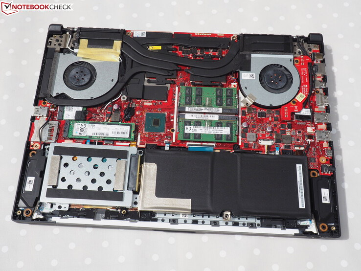 In Bezug auf die Wartung gibt es keine großen Überraschungen. Nachdem man das D-Cover von seinen Kreuzschrauben befreit hat, lässt sich die Bodenplatte vollständig entfernen (was allerdings nur mit einem flachen Hebelwerkzeug gelingt). Unter der Haube warten nicht nur das Funkmodul und der Akku, sondern auch zwei DDR4-RAM-Bänke, ein M.2-Slot des Typs 2280 und ein 2,5-Zoll-Schacht. Das Kühlsystem setzt sich aus zwei Lüftern zusammen, von denen mehrere Heatpipes ausgehen.
