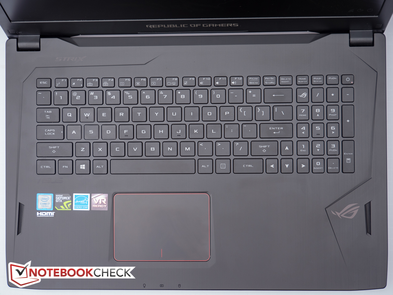 Das Asus ROG Strix GL702VI ist ausgestattet mit einer 4-Zonen hintergrundbeleuchteten Chiclet-Tastatur (3 Helligkeitsstufen + aus) mit optisch abgesetzten WASD-Tasten. Das Tippen war generell dank gutem Feedback und wohldefiniertem Auslösemoment sehr angenehm. Laut Hersteller beträgt der Hub der Scissor-Switches der Tasten 1,8 mm. Die Tastatur klappert nur äußerst minimal und ist selbst in leisen Umgebungen nicht störend. Wie bereits zuvor erwähnt gibt die Tastatur unter Druck nach und wölbt sich leicht nach innen. Außerdem fühlen sich die 12 mm kleinen Tasten des Ziffernblocks einen Ticken weicher an. Die Hintergrundbeleuchtung ist einstellbar und in vier Zonen aufgeteilt. Begeisterte Gamer werden die fehlenden dedizierten Macro-Tasten sicherlich vermissen, außerdem stören wir uns auch an der Position des Ein/Aus-Schalters. Dieser befindet sich in der obersten Reihe der Funktionstasten ganz rechts außen direkt neben der Bild-Ab-Taste und ist somit recht leicht versehentlich zu erwischen.