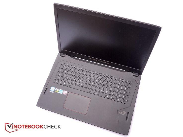 Das Gehäuse des GL702VI besteht aus einem Mix an Materialien. Der Körper ist aus Kunstoff gefertigt, die Rückseite des Displays hingegen aus gebürstetem Metall mit äußerst filigraner Oberflächenstruktur. Mittig befindet sich das chromfarbene Asus-Logo, eingerahmt von zwei ebenfalls chromfarbigen Streifen, die zusammen mit dem Logo rot leuchten, wenn der Laptop eingeschaltet ist. Die Abdeckung der Unterschale um die Tastatur herum verfügt über dieselbe Oberflächenstruktur wie der Displaydeckel, die Unterseite ist dagegen aus deutlich robusterem Kunststoff gefertigt. In diesem Fall ist das tatsächlich vorteilhaft, da die Finger beim Tragen ordentlich Grip haben und nicht so leicht abrutschen. Und wo wir gerade beim Herumtragen sind: Sowohl der Deckel als auch die Oberschale sind äußerst empfindlich für Fingerabdrücke, deren Beseitigung aber im Vergleich zu so manchem anderen Notebook relativ einfach zu bewerkstelligen ist. Robustheit und Verarbeitungsqualität hinterlassen einen eher gemischten Eindruck. Während die Base sehr ordentlich verarbeitet und ziemlich steif ist, Verwindungskräften sehr gut standhält und dabei nur minimal knarzt, ist das Display deutlich fragiler und nicht ganz so sauber verarbeitet und zeigt um das Display herum sichtbare und ungleichmäßige Spalte. Zudem lässt es sich leicht verwinden und knarzt auch hörbar beim Versuch. Schon geringfügige Krafteinwirkung auf der Rückseite führt zu Welleneffekten und Bildstörungen auf der Vorderseite. Auch die Tastatur gibt spürbar nach, insbesondere im Bereich zwischen dem Haupttastenfeld und dem Ziffernblock. Dies sollte allerdings nur für schwere Hände ein Problem darstellen. Konkurrenten wie das deutlich teurere Alienware 17 R4 verfügen über ein wesentlich robusteres und besser verarbeitetes Gehäuse aus höherwertigen Soft-touch-Materialien.