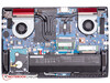 Insgesamt 10 Kreuzschlitz-Schrauben müssen entfernt werden, ehe der Unterboden mit etwas Kraftaufwand abgenommen werden kann; eine dedizierte Wartungsklappe gibt es nicht. Die Plastikhaken sind zwar recht fest, können aber mit Hilfe einer Kreditkarte recht leicht zum Nachgeben überredet werden. Einmal geöffnet hat man Zugriff auf die zwei DDR4-SODIMM-Slots (einer belegt), die M.2-SSD, die 2,5-Zoll-HDD, das WLAN-Modul sowie die zwei Lüfter. Der Akku kann ebenfalls ausgetauscht werden, falls dies nötig sein sollte.