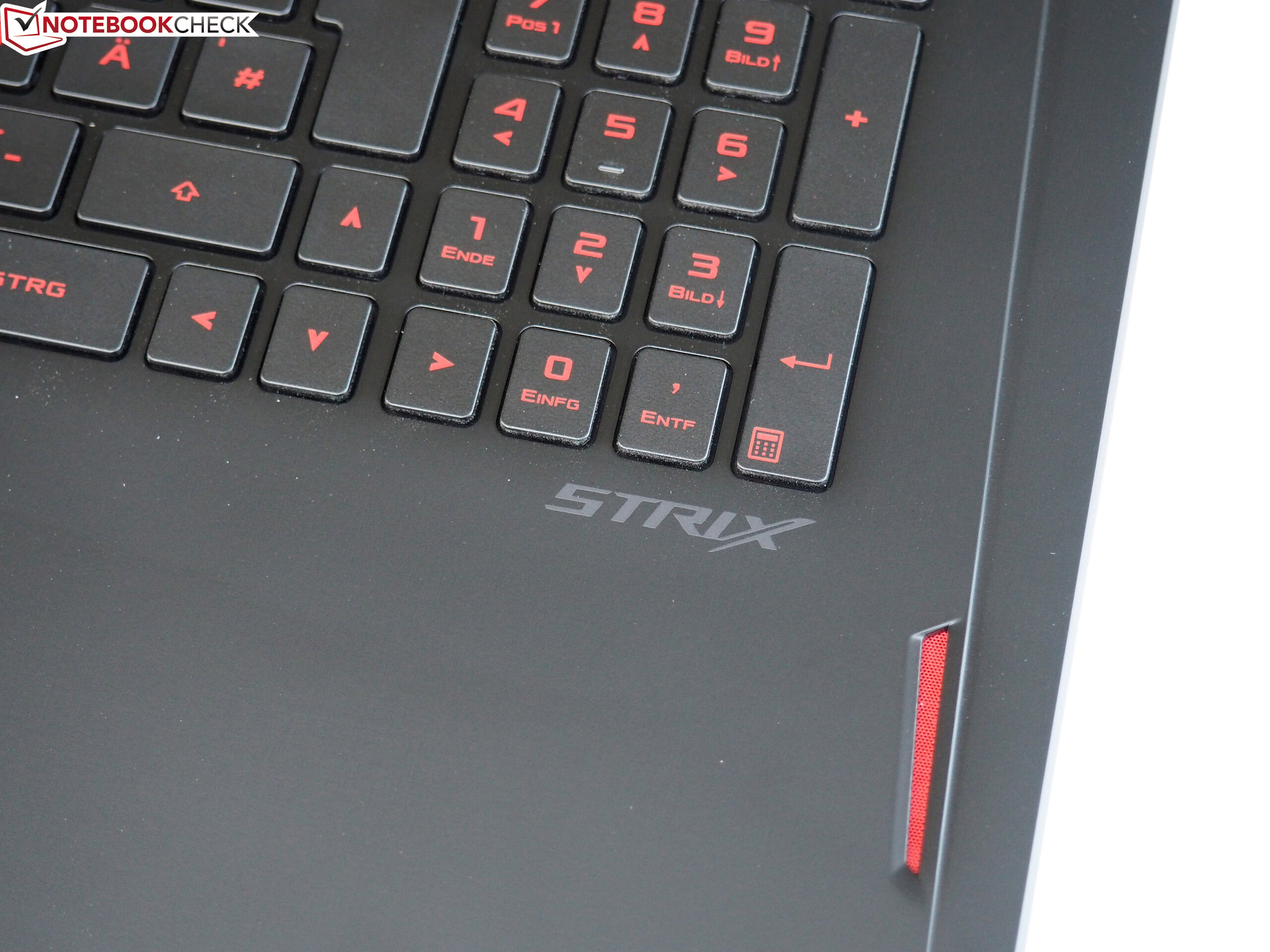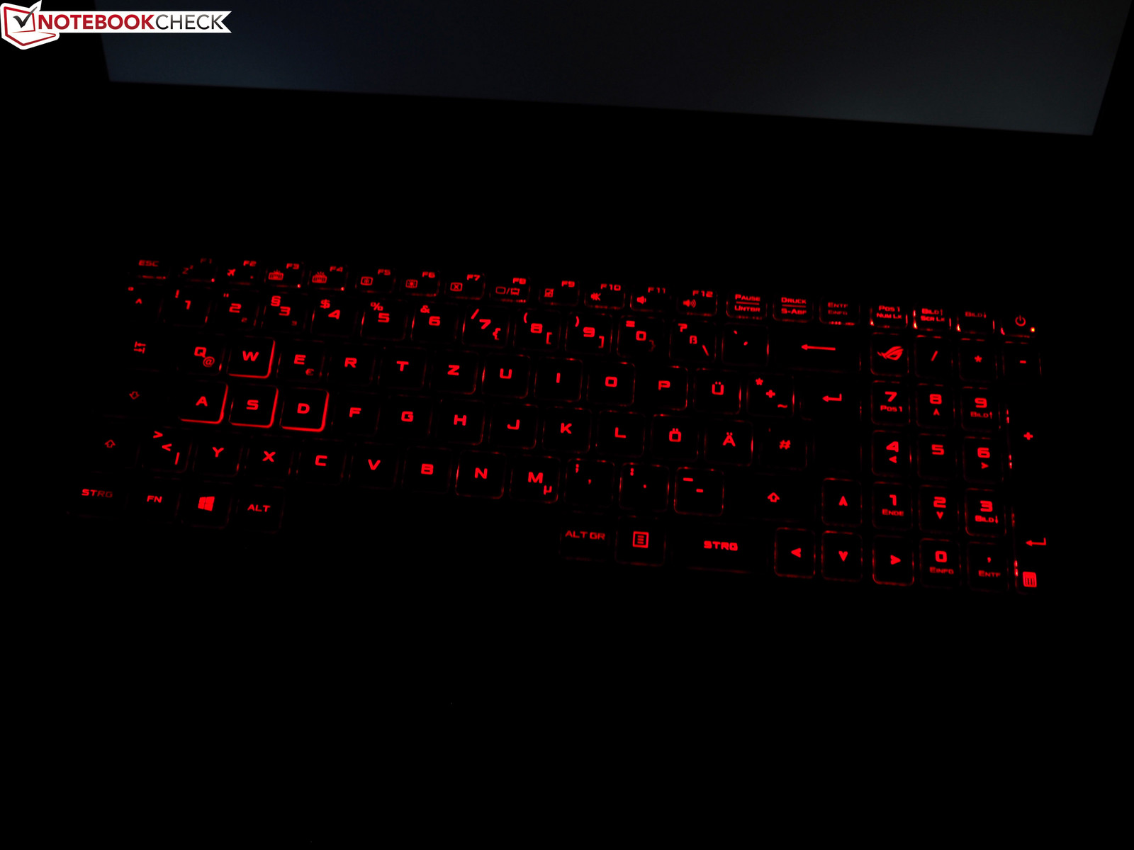Apropos Backlight: Entgegen dem aktuellen Trend verzichtet Asus auf eine RGB-Beleuchtung einzelner Tasten, sondern setzt im kompletten Keyboard-Areal auf ein mehrstufig regelbares Rot. Auch Makro-Tasten glänzen beim GL702ZC mit Abwesenheit, ob man dieses Feature nun für wichtig hält oder nicht (wir tendieren zu Letzterem). Nachbessern sollte Asus bei der Tastenbeschriftung. Durch das blasse Rot leidet die Sichtbarkeit mehr, als es uns lieb ist - selbst tagsüber. Nicht umsonst verwenden die meisten Hersteller eine weiße Schrift.