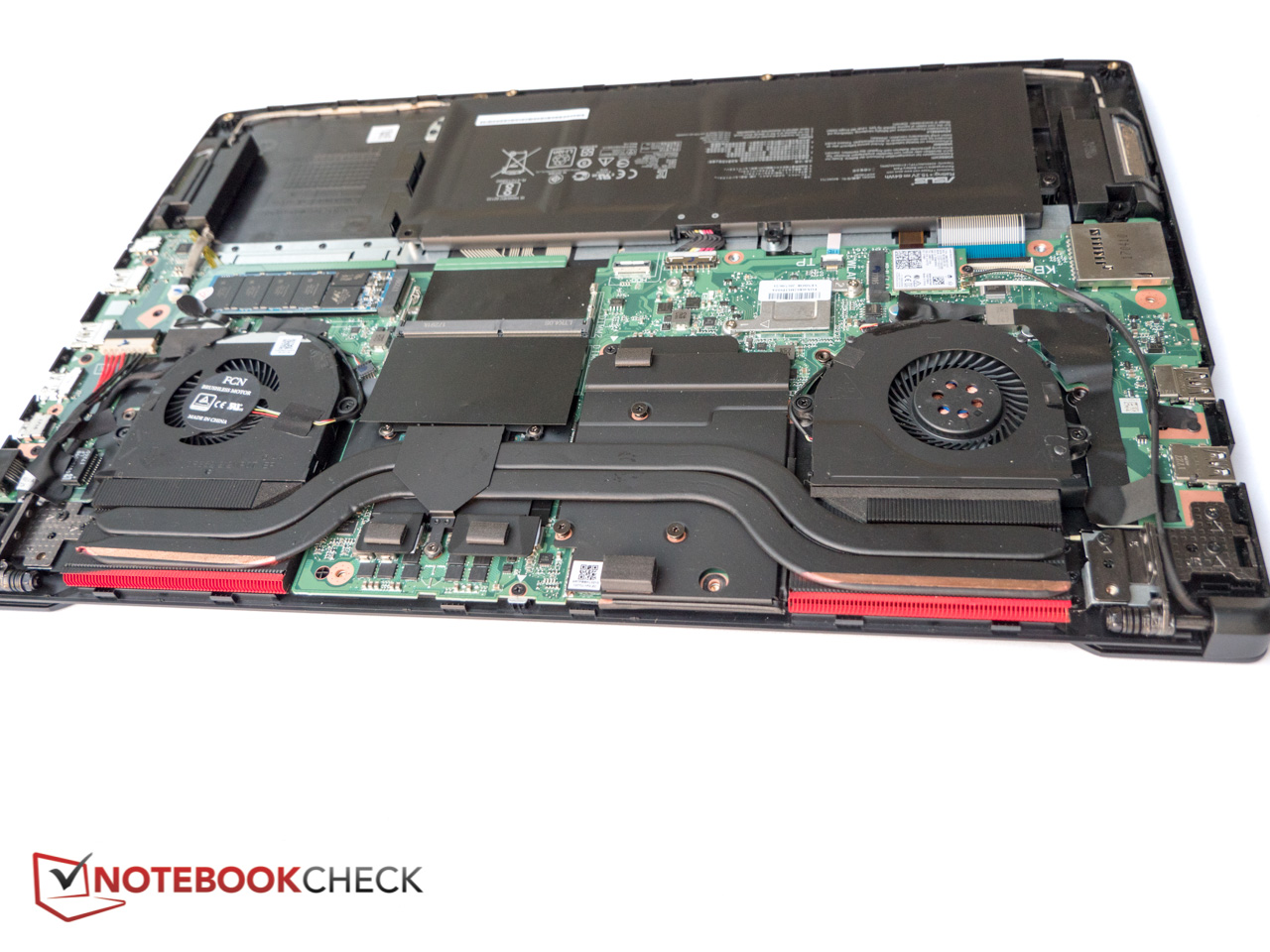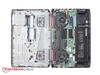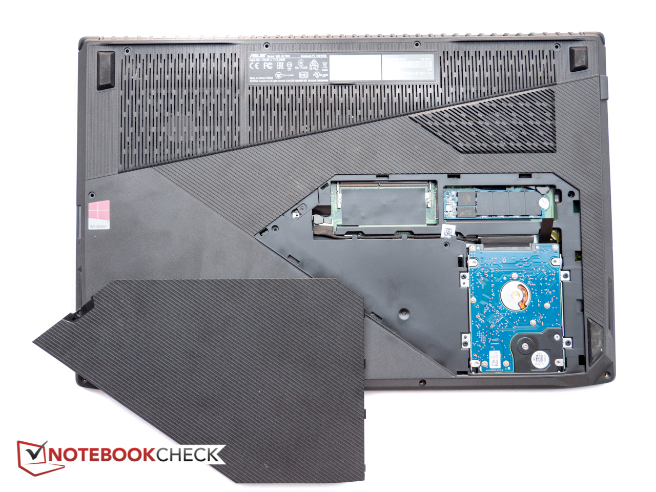 Die allgemeine Wartbarkeit des Notebooks ist dank dedizierter ungleichmäßig geformter Wartungsklappe sehr gut. Dahinter verstecken sich der zweite (in unserem Fall leere) RAM-Slot, die M.2-SSD und die 2,5-Zoll-HDD. Zur Reinigung des Lüfters oder um den anderen RAM-Slot zu erreichen, muss die Bodenplatte entfernt werden, was jedoch ebenfalls relativ einfach zu bewerkstelligen ist: 13 Kreuzschlitz-Schrauben, wovon drei sich unter der Wartungsklappe befinden, und der Boden ist ab. Unser Testgerät war mit einer SATA-III-SSD ausgestattet, der M.2-Slot unterstützt aber auch PCIe/NVMe-SSDs.