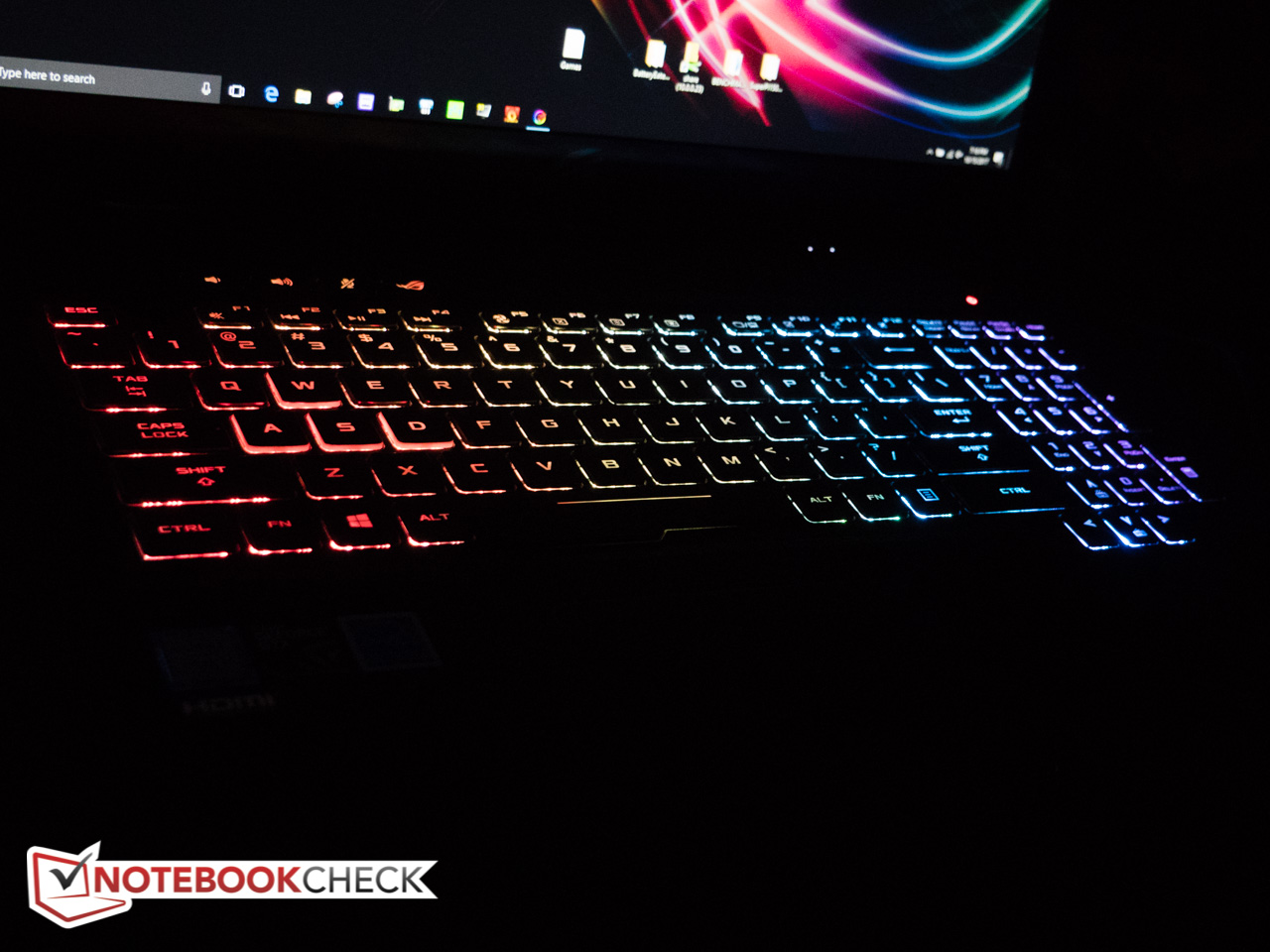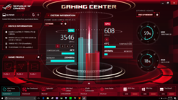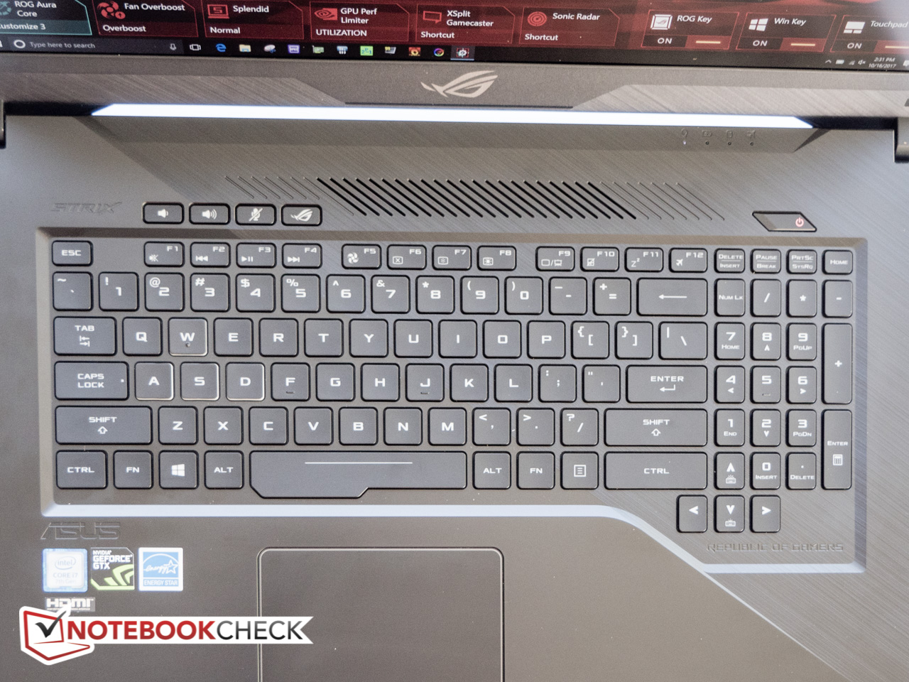 Im Strix GL703VD ist die Aura Tastatur mit RGB-Hintergrundbeleuchtung verbaut (3 Helligkeitsstufen + aus), die eine individuelle Anpassung der vier Zonen erlaubt. Der Tastenhub liegt bei knapp 2 mm und ist damit zwar überdurchschnittlich, aber trotzdem kürzer als die 2,5 mm des ROG Strix GL753VD. Abhängig von der jeweiligen Situation muss ein kurzer Hub jedoch nicht unbedingt von Nachteil sein. Das Tippen hinterlässt einen gemischten Eindruck: Die Tasten sind zwar leicht gewölbt, was der Genauigkeit bekömmlich ist, der Tastenanschlag und das Feedback sind für unseren Geschmack jedoch zu weich. Die Space-Taste ist links größer als rechts, und drei der vier Pfeiltasten sitzen unterhalb des allgemeinen Tastenfelds der Tastatur, um sich besser abzusetzen. Die meisten Tasten sind angenehm leise, Space ist dafür aufdringlich und unangenehm laut. Links oberhalb der F-Tasten befinden sich vier dedizierte Medientasten - drei steuern die Lautstärke (stumm/leiser/lauter), die vierte startet das ROG Gaming Center.