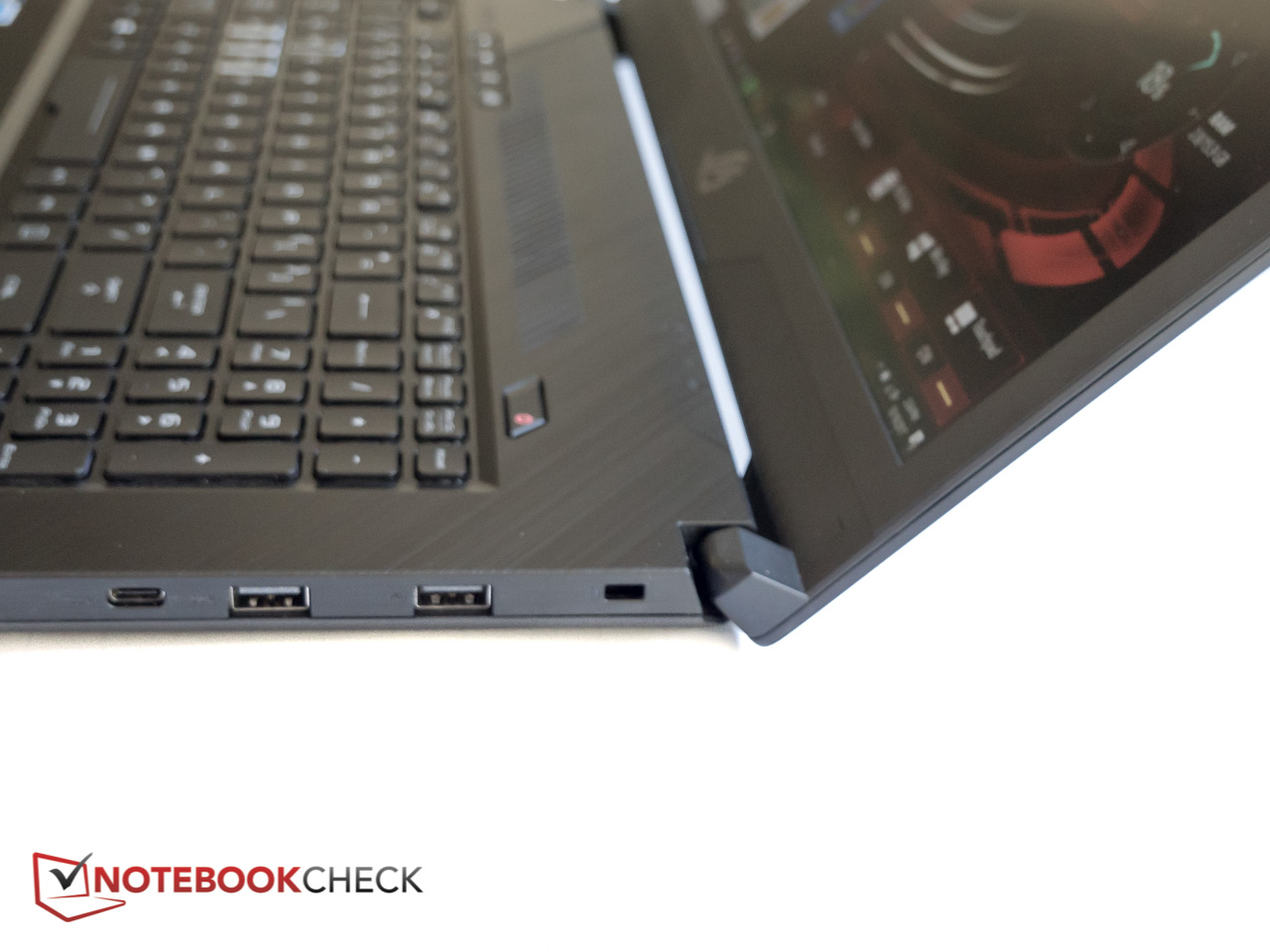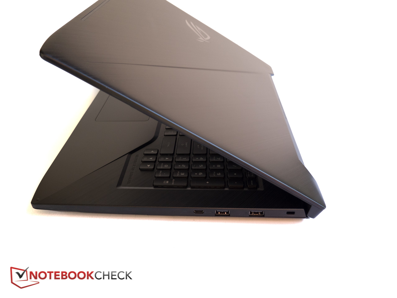 Trotz dem dünnen Design scheint das Strix GL703 recht stabil gebaut zu sein. Die Base ist solide und knarzt nur minimal, wenn man versucht, sie zu verwinden. Die Scharniere sind stramm und halten das Display bis zum maximalen Öffnungswinkel von 135 Grad zuverlässig in Position. Dank dem Gewicht der Base ist einhändiges Öffnen des Deckels möglich. Die Tastatur gibt bereits bei moderatem Druck in der Mitte spürbar nach, und auch die rechte Handballenablage ist davor nicht gefeit. Der Displaydeckel verwindet sich recht schnell, was jedoch selbst bei mittlerer Kraftausübung keinen sichtbaren Effekt auf das Panel hat (sprich: kein Welleneffekt). Insgesamt liegen Robustheit und Stabilität eine Stufe über der von vielen reinrassigen Plastikbombern.