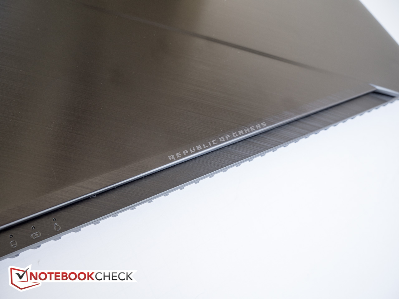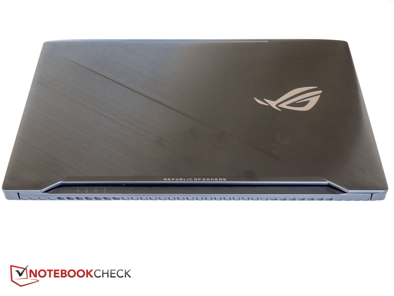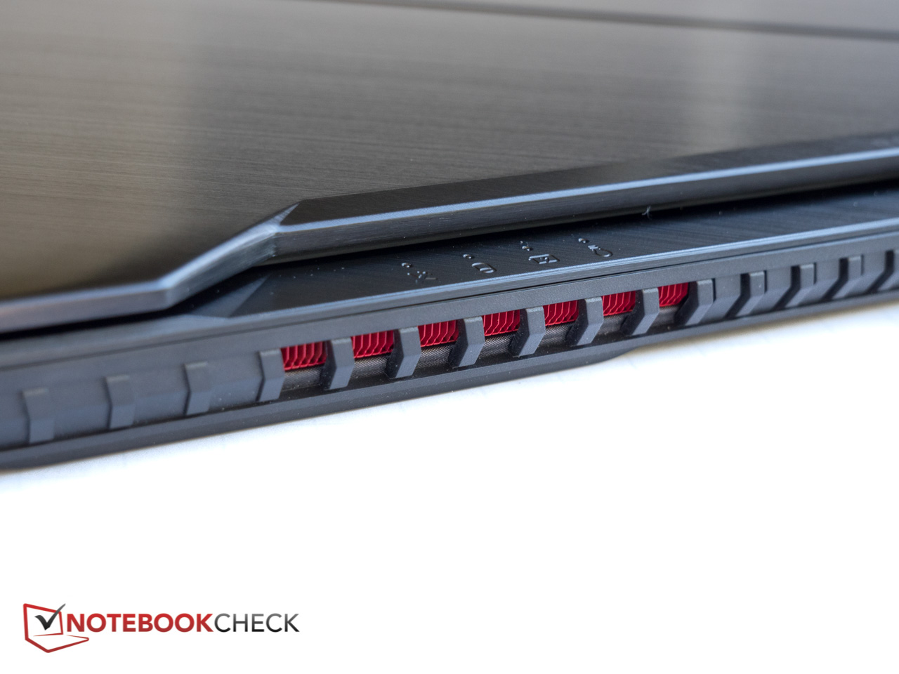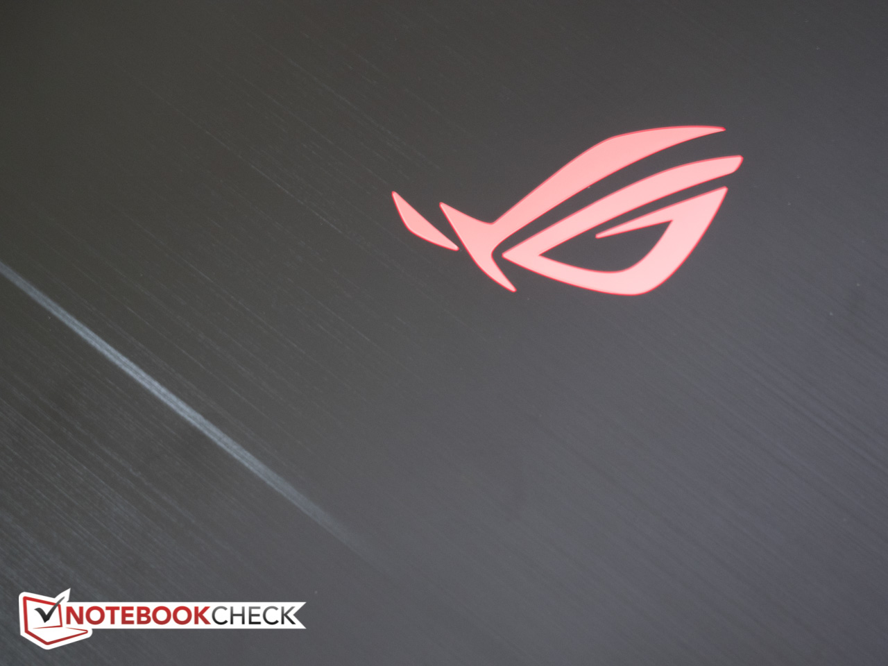 Schönheit liegt bekanntlich im Auge des Betrachters, aber unseren Augen zufolge ist das Strix GL703 eines der besser aussehenden Einsteiger-Gaming-Notebooks. Das gebürstete Aluminium des Deckels - eine offensichtliche Anlehnung an das Flaggschiff ROG Zephyrus - verfügt über eine sehr feine Struktur und einen abgesetzten diagonalen Streifen samt prominent platziertem, seitlich versetztem ROG Logo. Auf den ersten Blick wirkt das Logo verchromt, in Wirklichkeit leuchtet es jedoch beim Einschalten rot auf. Leider zieht der Deckel Fingerabdrücke geradezu magisch an. Innen finden sich verhältnismäßig dünne, matt-schwarze Seitenränder (13 mm links und rechts sowie 17 mm an der Oberseite) und ein weiteres ROG Logo unterhalb des Bildschirms. Die Oberseite der Base ist zweigeteilt und verfügt ebenfalls über einen diagonalen Streifen von links oben nach rechts unten. Texturiert ist jedoch nur der rechte Teil dieser Struktur, so dass die Handballenablagen angenehm glatt sind. Durch die Lüfterschlitze schimmern die roten Kühlkörper - untrügliche Anzeichen für die Abstammung des Notebooks und Abgrenzung vom üblichen Multimedia-Einerlei. Insgesamt ist das GL703 nicht ganz so aufdringlich wie andere Notebooks.