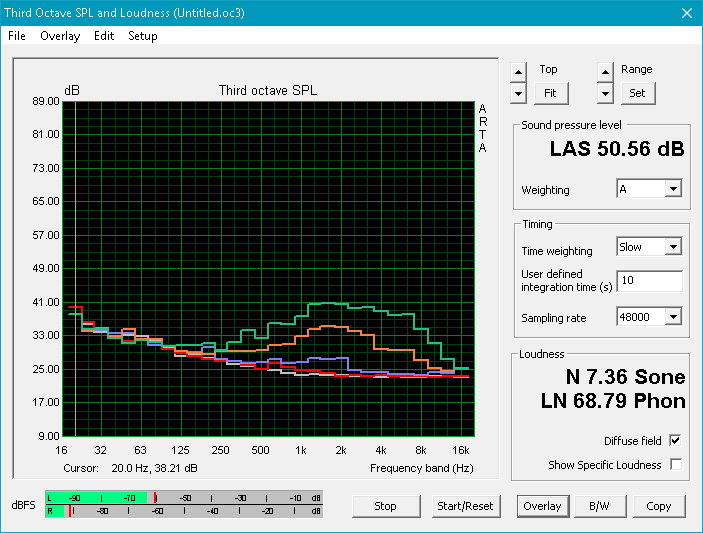 Graph 1: Pink Noise 100% Vol.; Graph 2: Audio aus