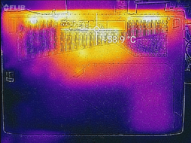 (-) Auf der Unterseite messen wir eine maximalen Wert von 62 °C (im Vergleich zum Durchschnitt von 43.3 °C).