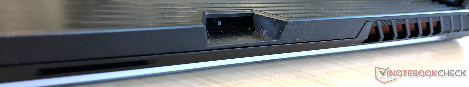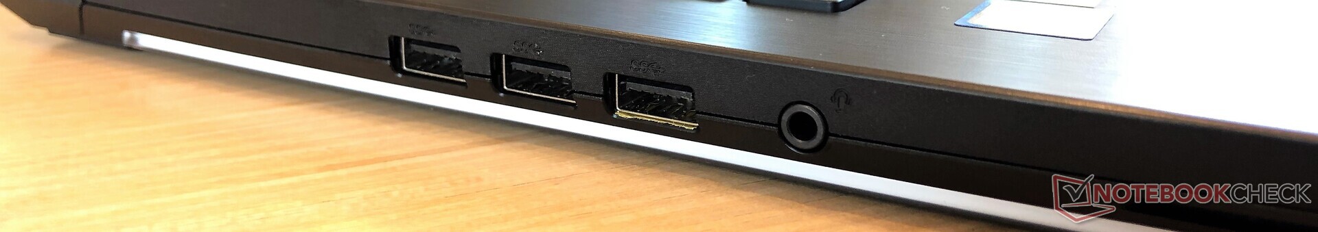 Wie bei den meisten Gaming-Laptops ist die Anschlussausstattung recht umfangreich. Dem Anschlusslayout stehen wir jedoch kritisch gegenüber. So befinden sich alle drei USB-3.1-Anschlüsse (Gen. 1) auf der linken Gehäuseseite. Da die überwiegende Mehrzahl der Spieler bevorzugt eine extere Maus verwendet, halten wir diese Entscheidung für fragwürdig. Wenn man eine Maus anschließen möchte, muss man das Kabel also um das Gehäuse herumführen, was etwas umständlich ist. Verschlimmert wird das Ganze durch die fast gänzlich ungenutzte rechte Kante des Chassis, auf der sich lediglich ein Abluftgitter und Asus' proprietärer Keystone-Slot befindet. Hier stünde mehr als genug Platz für einen zusätzlichen USB-Anschluss zur Verfügung. Obwohl die USB-3.1 Typ-C Schnittstelle DisplayPort unterstützt, hätten wir uns außerdem über einen zusätzlichen, spezifischen Displayanschluss gefreut. Der nicht vorhandene SD-Kartenleser macht uns außerdem stutzig.