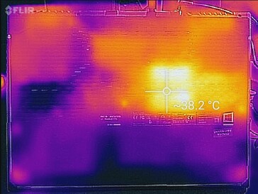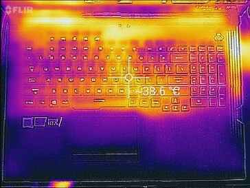 Das G731GW wird unter Last aufgrund der leistungsfähigen Hardware im Inneren sehr warm. Trotzdem gelingt es der Kühllösung, die Wärme von den Teilen des Laptops fernzuhalten, mit denen die Hände des Nutzers in Kontakt kommen. Die Tastatur erwärmt sich unter Last (vor allem im Zentrum), die WASD-Tasten erreichen jedoch keine unangenehm hohen Temperaturen. Die Unterseite wird an der oberen Kante heiß, weshabl wir empfehlen, den Laptop auf einer ebenen, freien Fläche abzustellen, um die seitliche und hintere Belüftung zu begünstigen.