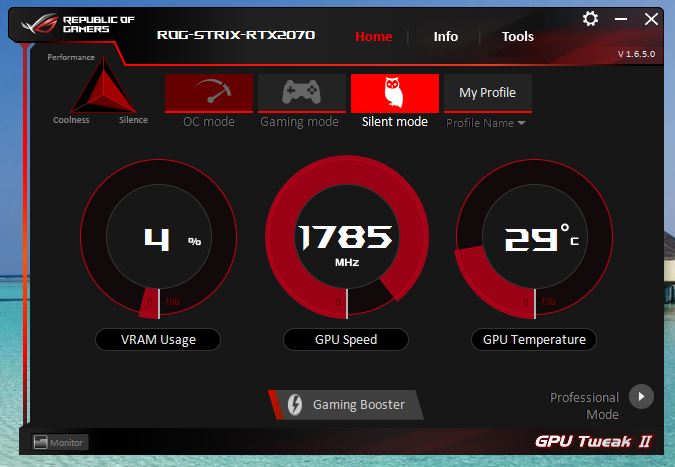 Bei den Taktraten liegt die Asus ROG RTX Strix 2070 OC im Boost sogar deutlich über der Founders Edition von Nvidia. Diese bietet im Boost maximal 1.710 MHz. Mit 1.815 MHz im Gaming-Mode taktet Asus die RTX 2070 gut 100 MHz höher. Mit dem Asus GPU Tweak lässt sich die Grafikarte auch im Silent- oder OC-Modus betreiben. Im Vergleich zum Gaming-Mode sinken bzw. steigt die GPU-Taktfrequenz um jeweils 30 MHz. Aber auch das Power-Target wird angepasst. So sinkt das Power-Target im Silent-Mode auf 90 %, wenngleich im OC-Mode dieses auf 110 % erhöht wird. Der Gaming-Mode ist mit 100 % ein guter Mittelwert, welchen wir auch für die Benchmarks benutzt haben.