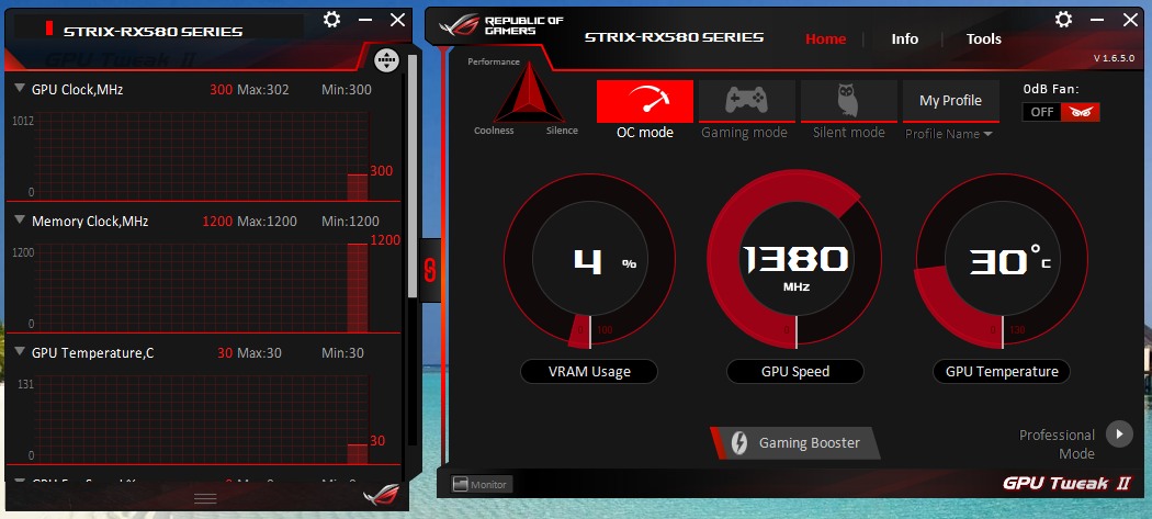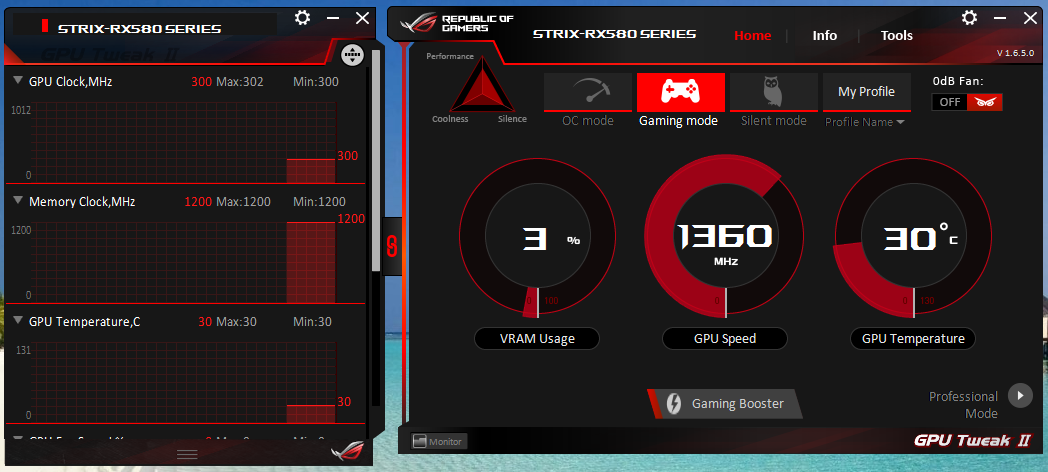 Wie schon erwähnt betreibt Asus die ROG Strix Radeon RX 580 oberhalb der Referenzspezifikationen. Der GPU-Basistakt liegt bei 1.360 MHz und der VRAM taktet mit 8.000 MHz. Mit dem Tool Asus GPU Tweak lässt sich aus vordefinierten Profilen (Silent, Gaming und OC) wählen. Im OC-Modus wird der GPU-Takt um 20 MHz angehoben und erreicht somit 1.380 MHz. Das kleine Tool erlaubt es dem Anwender aber auch manuell an der Taktschraube zu drehen. Auch das Power-Target und das Temperature-Target lässt sich per Schieberegler verstellen.