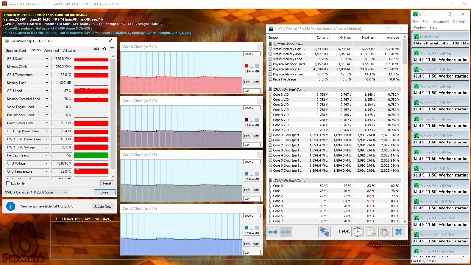 Die Temperaturentwicklung fällt ebenfalls hapig aus: Bis zu 59 °C auf der Oberseite nach 60 Minuten Stresstest mit den Tools Furmark & Prime95 markieren den höchsten Wert im Testfeld. Die restlichen Werte tendieren zur Konkurrenz. Im Idle-Modus bleibt das Scar 17 mit rund 30 °C hingegen am kühlsten. Den Komponenten, also Core i9-10980HK und GeForce RTX 2080 Super, konnten wir unter Volllast rund 80 °C entlocken, was noch passabel ist, wobei die CPU in dieser Extremsituation auf ca. 1,9 GHz drosselt.
