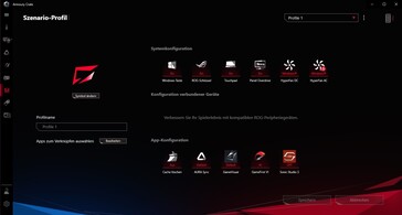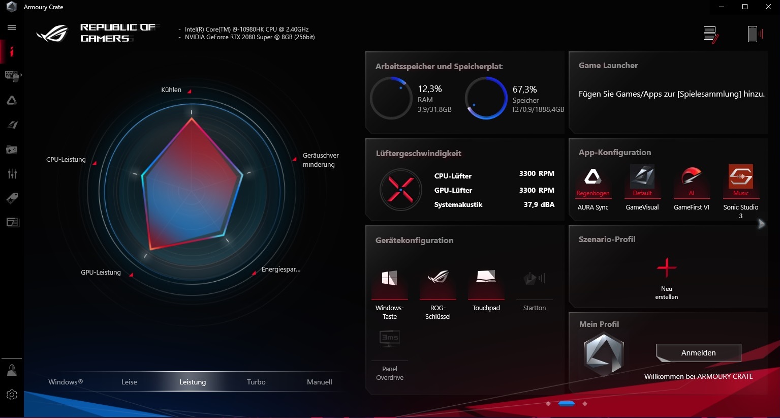 Was wäre ein Gaming-Notebook ohne mächtige Tuning-Software? Die Armoury Crate von Asus steht den Tools der Konkurrenz (z. B. dem Dragon Center von MSI) in nichts nach. Unsere Messungen wurden dabei mit dem Profil „Leistung“ durchgeführt. Das Turbo-Profil wirkt sich laut Visualisierung vor allem auf die CPU-Performance aus. Zwar steigt auch der Takt der Grafikkarte um 100 MHz, in der Praxis bleiben davon aber nur rund 50 MHz übrig, was keinen großen Unterschied macht. Aufgrund des hohen Geräuschpegels (dazu später mehr) würde sich für Idle-Situationen und bei anspruchslosen Aufgaben der Leise-Modus empfehlen. Leider scheint dieser kaum Verbesserungen zu bringen.