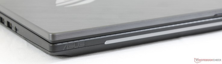 Auch wenn das neue Design kompakter ist als beim GL703, hat Asus das Kunststück fertig gebracht, sämtliche Anschlüsse des Vorjahres auch im neuen Modell unterzubringen. Die meisten befinden sich auf der linken Seite des Geräts und alle sind gut erreichbar. Der einzelne USB-C Port unterstützt nur Gen. 2 mit Geschwindigkeiten von bis zu 10 Gbit/s. Thunderbolt 3 ist leider nicht im Angebot.