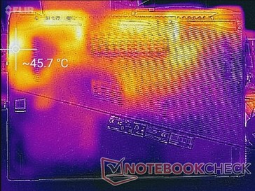 Beim Spielen und bei höherer Last erreichten die Temperaturen an der Rückseite über 46 °C. Das GL703GM lag hier bei 53 °C.
