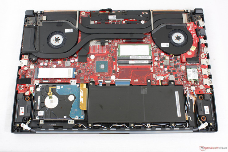 Der Unterboden kann relativ einfach mit Hilfe eines Kreuzschlitzschraubendrehers und eines spitzen Gegenstands entfernt werden. Darunter befinden sich zwei Massenspeicherschächte, zwei SO-DIMM-Slots, Kühler, Akku und WLAN-Karte. Verglichen mit der Vorgängergeneration hat sich die interne Hardware deutlich verändert und das konventionelle Design erlaubt eine bessere Wartbarkeit als bei der Zephyrus-GX-Serie.