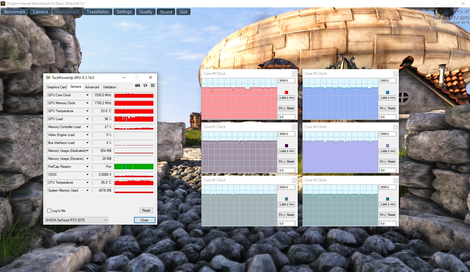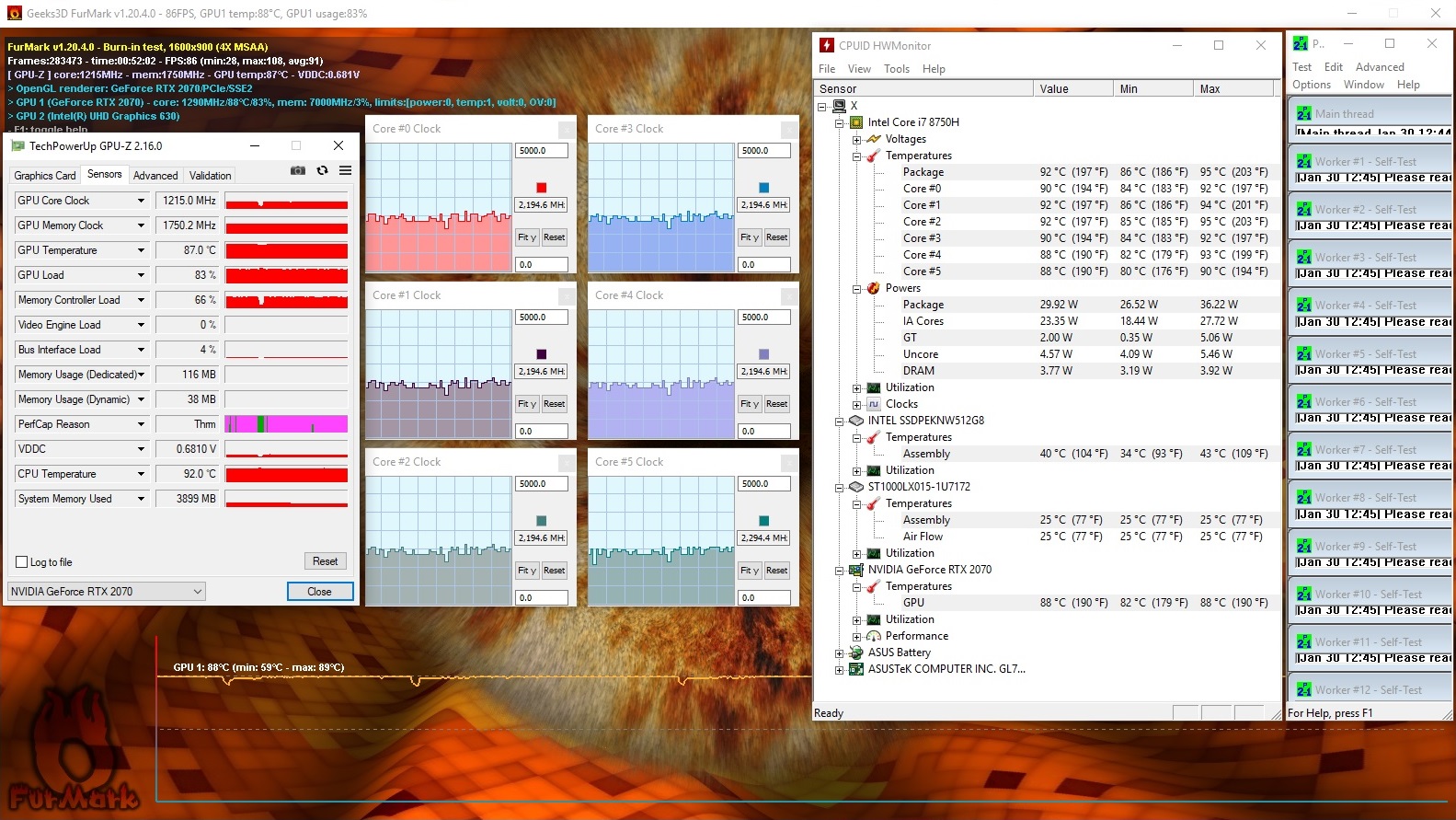 In unserem Stresstest mit den beiden Tools Prime95 und FurMark werden sowohl die CPU als auch die GPU sehr warm (fast 90 °C), die Leistung ist aber dennoch reduziert. Die Grafikkarte arbeitet mit etwas mehr als 1.200 MHz, während die 6 Kerne des Prozessors mit 2,2 - 2,3 GHz laufen. Wie wir gerade schon gesehen haben, wird die Leistung beim Spielen aber nicht eingeschränkt.