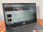 Asus verwendet wie schon beim GL704GM ein mattes Full-HD-Panel von AU Optronics (B173HAN04.0), welches mit einer Bildwiederholfrequenz von 144 Hz und den schnellen Reaktionszeiten für ein besonders flüssiges Spielerlebnis sorgen soll. Asus gibt bei den technischen Daten "IPS-grade" an, es handelt sich aber um ein AHVA-Panel. Der große Unterschied liegt in der höheren Frequenz, dafür können IPS-Panels einen etwas größeren Farbraum abdecken. Subjektiv ist der Bildeindruck sehr gut, denn die Inhalte sind sehr scharf und es gibt auch keinen körnigen Bildeindruck unter dem matte Bildschirme manchmal leiden. Am unteren Rand kommt es zu leichtem Screen-Bleeding, was aber auch nur bei der maximalen Helligkeit in Kombination mit einem dunklen Inhalt wirklich sichtbar ist.