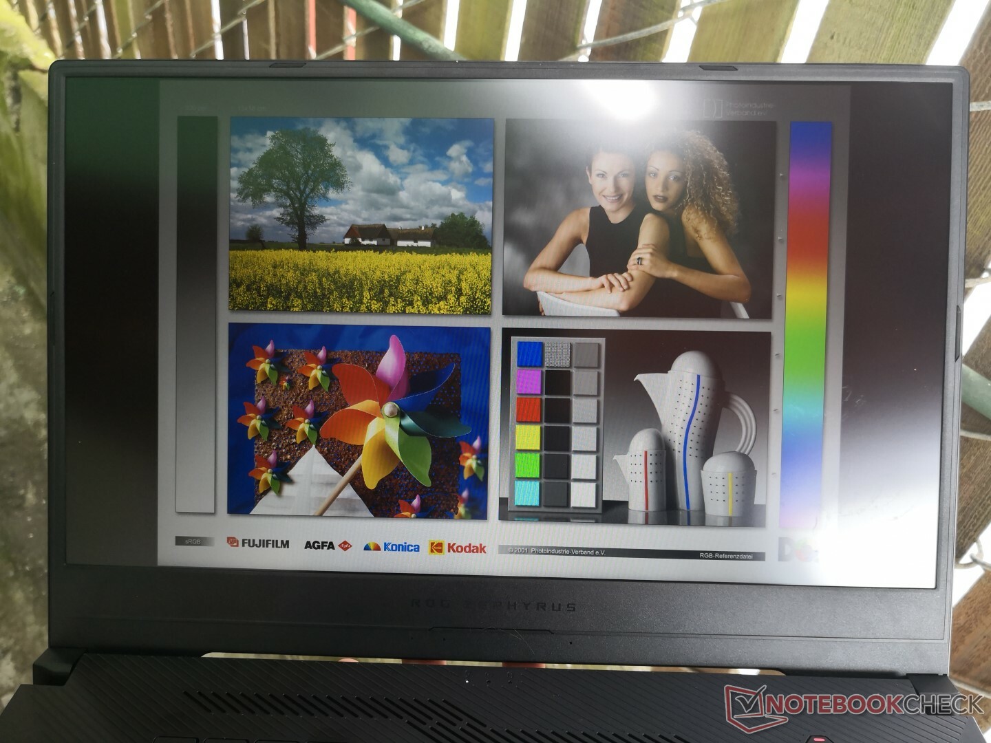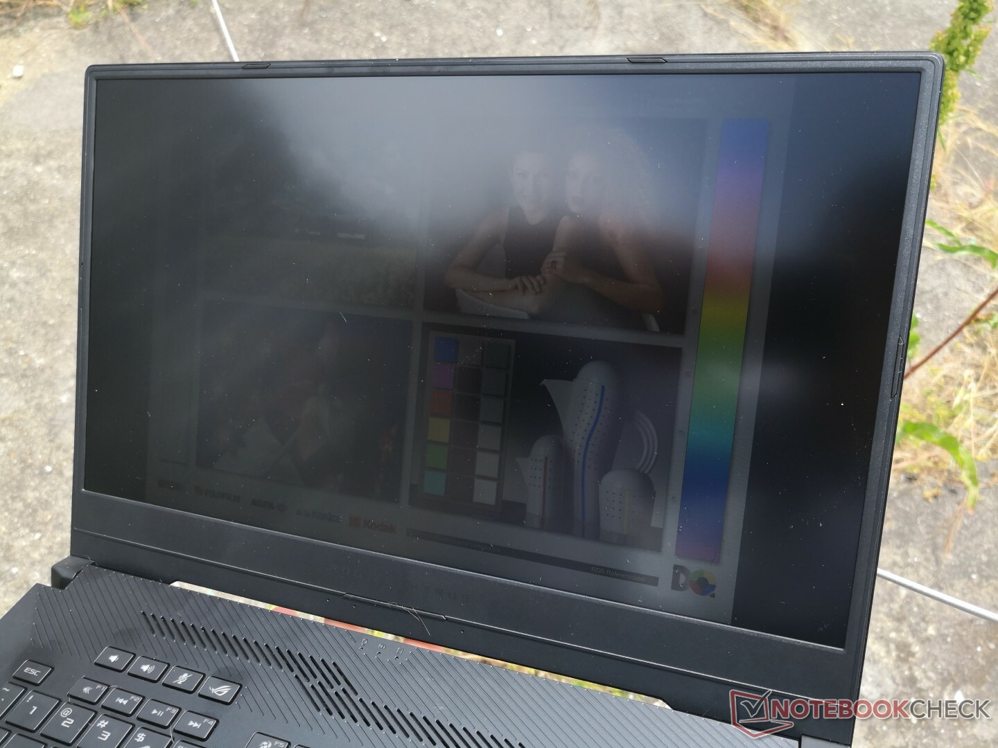 Weitergehende Messungen mit einem X-Rite-Spektrofotometer offenbarten akkurate Graustufen, mittelgute Farbdarstellung und eine ins Kühle verschobene Farbtemperatur. Mittels Kalibrierung konnten wir alle Aspekte, insbesondere die Darstellung von Graustufen, sichtbar verbessern. Leider blieben Farben bei höheren Sättigungsstufen weiterhin sehr ungenau, was auf die niedrige Farbraumabdeckung des Panels zurückzuführen ist. Blautöne litten hierunter ganz besonders. Diese Ungenauigkeit stört beim Gaming zwar eher nicht, Kreative sollten aber lieber das Zephyrus GX531 oder GX501 in Betracht ziehen.
