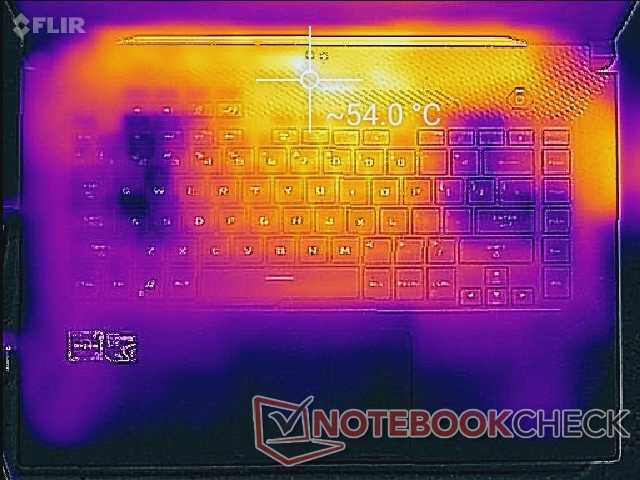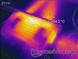 Dank des Kühlsystems sind die Oberflächentemperaturen weitestgehend symmetrisch. Im Leerlauf und bei niedriger Last blieben Handballenablage und Tastatur angenehm kühl. Die Hotspots lagen im hinteren Bereich, wo man eher selten hinfasst.