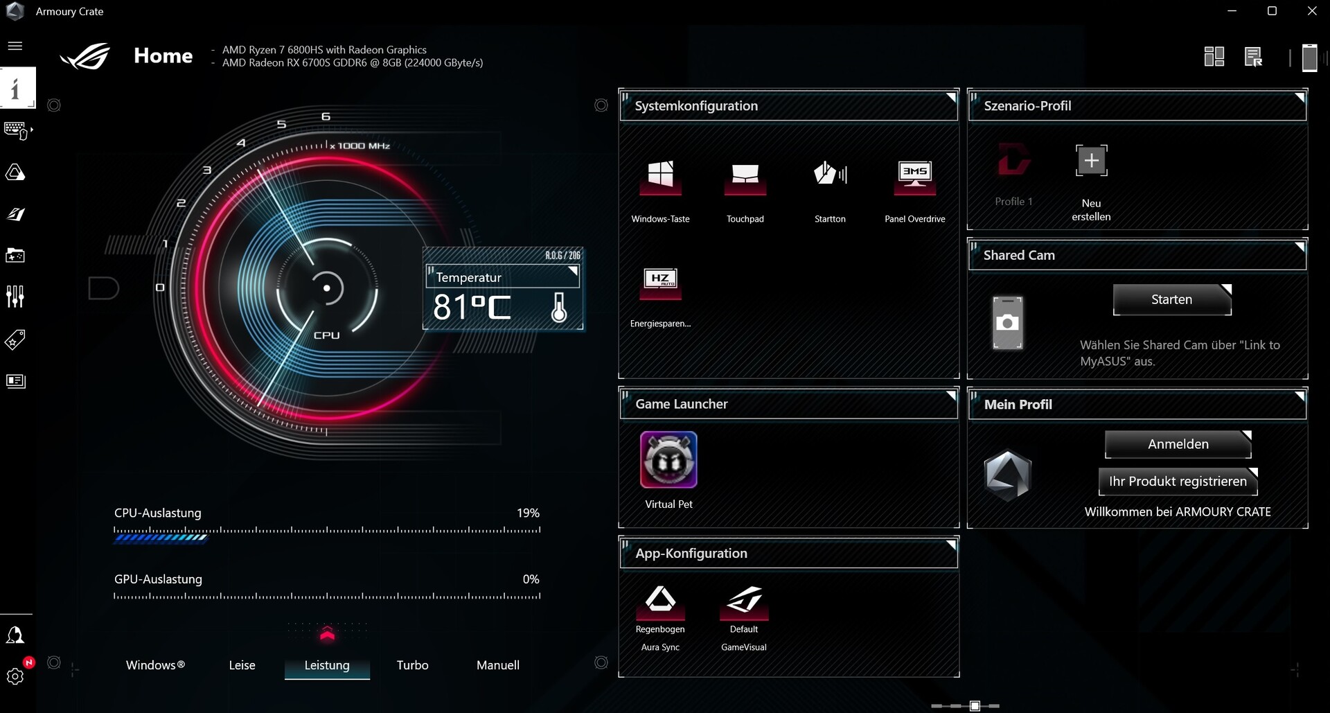 Die mächtige Armoury Crate (siehe Screenshots) hat sich seit dem Test des GA402RK etwas verändert. Um vergleichbare Bedingungen zu erhalten, haben wir möglichst ähnliche Settings gewählt. Während die 3D- und Gaming-Benchmarks mit dem Turbo-Profil und dem GPU-Modus Ultimativ durchgeführt wurden, sind die restlichen Messungen mit dem Leistungsprofil und dem GPU-Modus Standard entstanden.