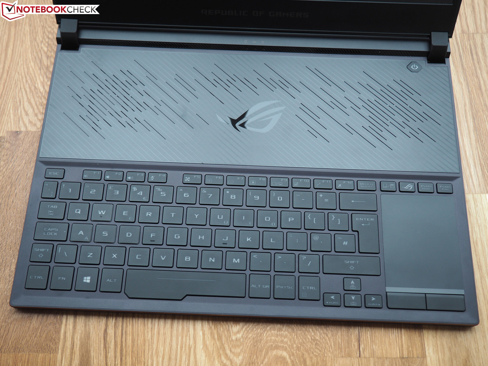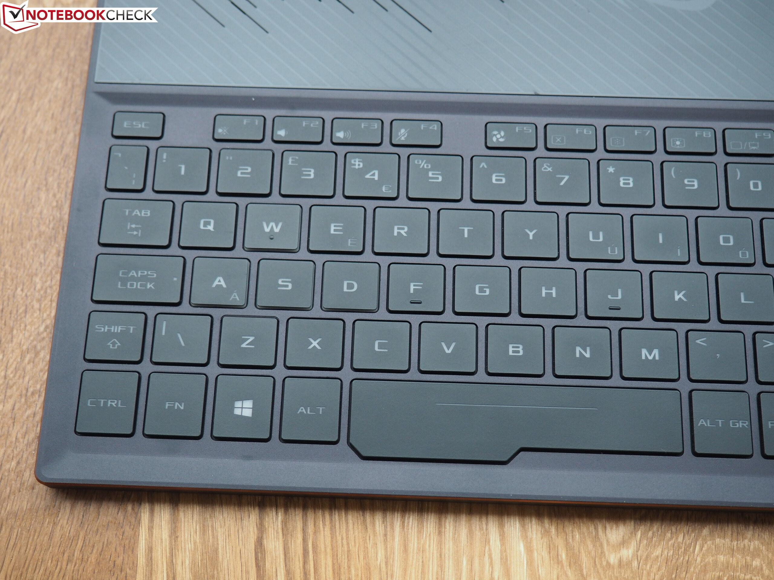 Das ROG Zephyrus S erkennt man sofort an seiner ungewöhnlich platzierten Tastatur, die bis auf kleinere Details (z. B. neu verteilte Fn-Funktionen) an das GX501 angelehnt ist. Die eingebaute RGB-Beleuchtung lässt sich mittels der Aura-Software umfangreich anpassen. Neben verschiedenen Farben entdeckt man auch mehrere Modi wie Breathing oder Rainbow, welche das GX531 zur Lichtshow machen.