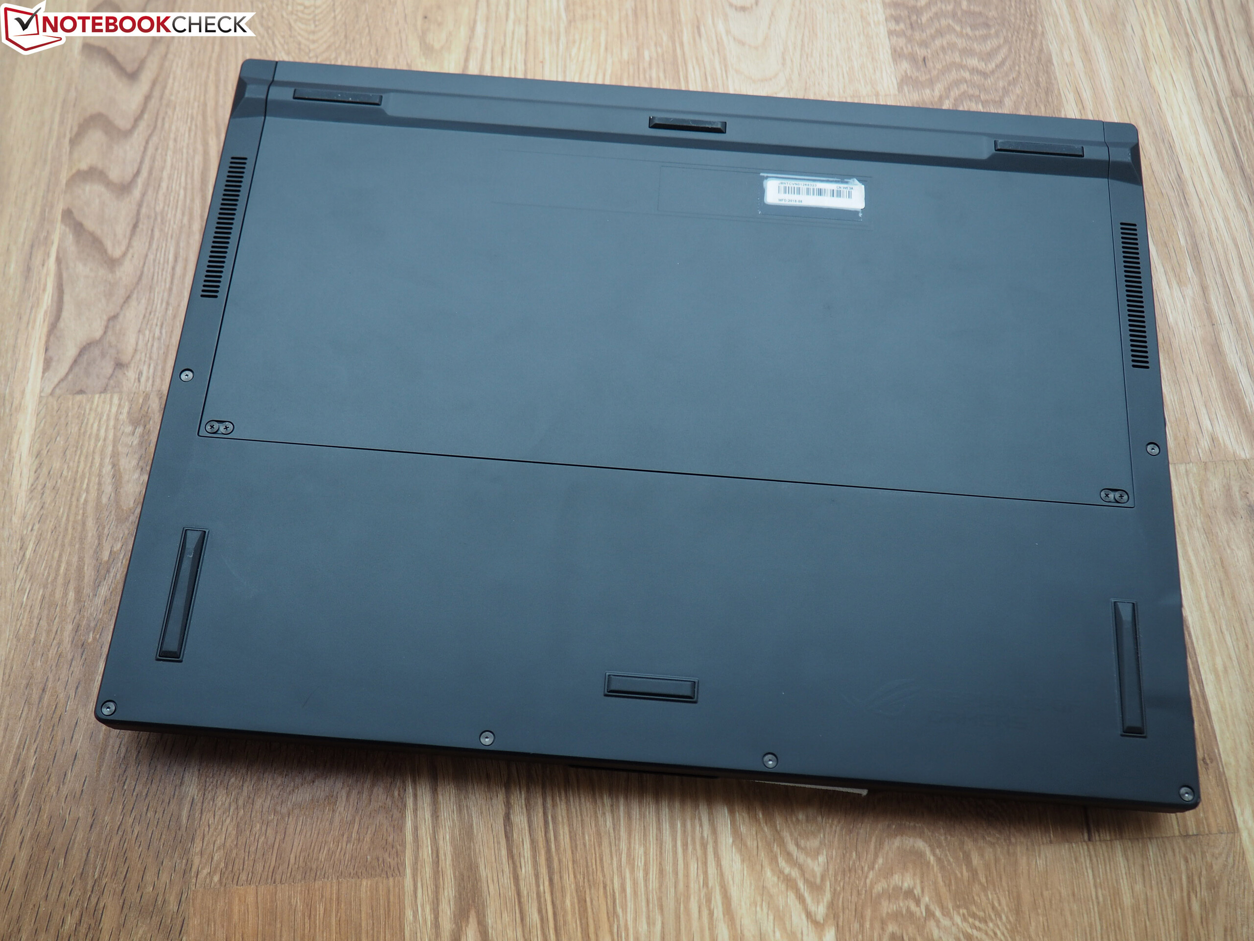 Etwas nachbessern könnte Asus bei den Scharnieren. Zwar kann der Deckel mit einer Hand geöffnet werden und bleibt bei Untergrunderschütterungen recht stabil, der maximale Öffnungswinkel erweist sich jedoch als äußerst klein. Zu den größten Alleinstellungsmerkmalen des 15-Zöllers gehört die vom GX501 bekannte, sehr ungewöhnliche Konstruktion der Unterseite. Beim Aufklappen des Displays schwingt ein Teil des Gehäusebodens mit, wodurch ein mehrere Millimeter breiter Spalt entsteht, welcher die Luftzirkulation verbessern und entsprechend bei der Kühlung helfen soll.