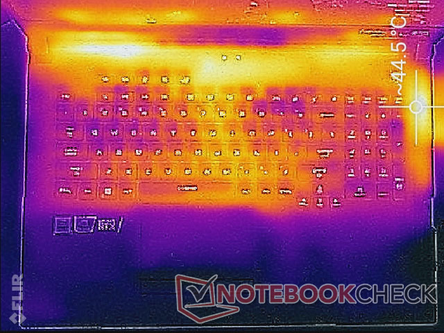 Unabhängig von den unterschiedlichen GPUs sind die Oberflächentemperaturen im Gaming-Betrieb mit denen des G731GW quasi identisch. Die Handballenauflagen, das Touchpad, die WASD-Tasten und die Tasten des Ziffernblocks bleiben beim Spielen angenehm kühl. Die wärmsten Stellen, die zwischen 40 und 44 °C erreichen können, befinden sich in der Tastaturmitte und am rechten Rand der Tastatur. Zum Glück kommt man mit diesen Bereichen beim Spielen jedoch nur selten in Kontakt.