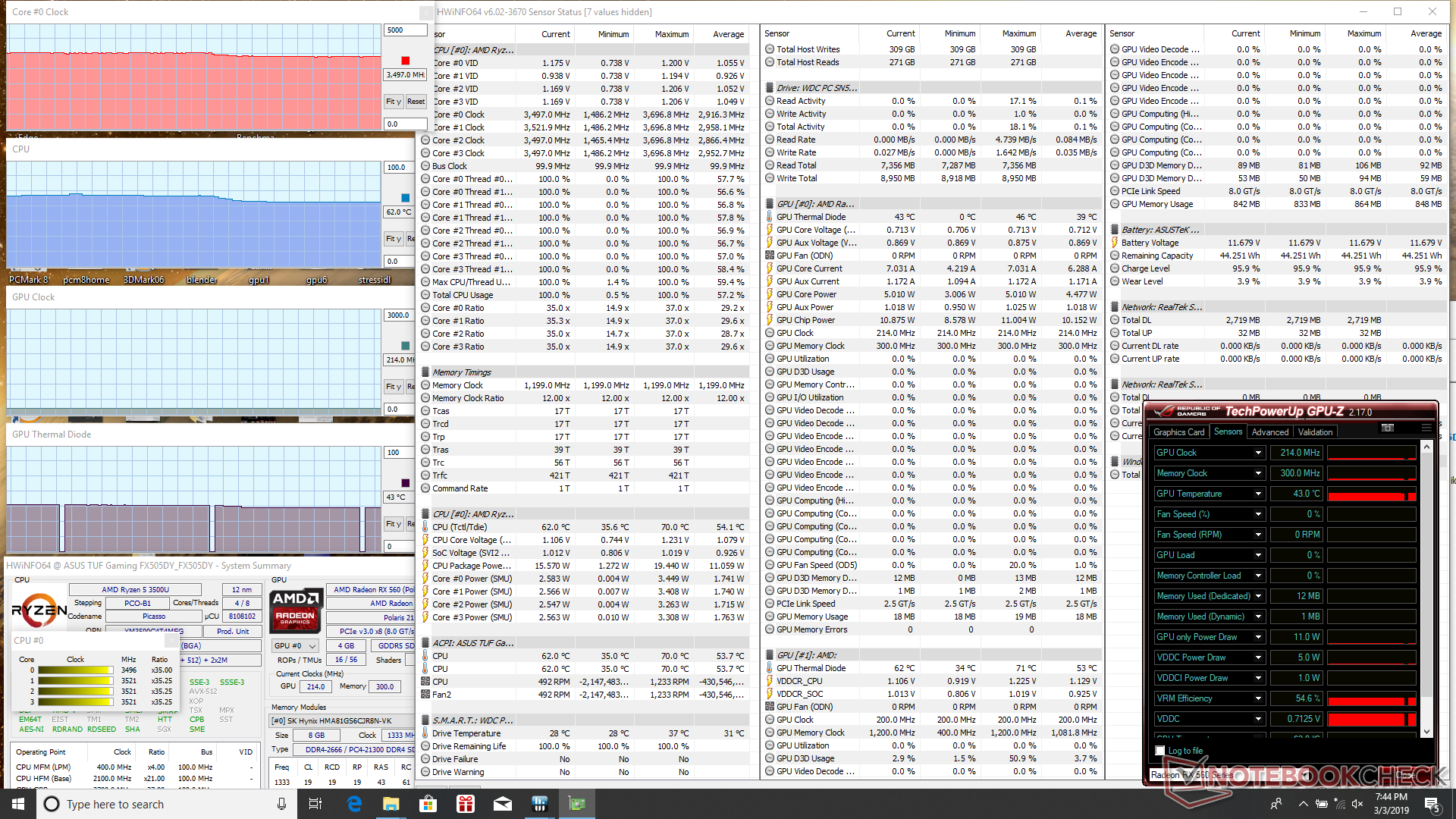 The Witcher 3 repräsentiert Gaming-Lasten in der Praxis jedoch besser. Hier stabilisieren sich CPU und GPU bei 60 °C bzw. 70 °C, beim FX504 mit Intel Core i5-8300H und GeForce GTX 1050 aus der letzten Generation waren es jeweils 74 °C und 66 °C. Dies verdeutlicht, dass die neue CPU von AMD kühler als ihr Intel Gegenstück ist und dass ihr Alter die Radeon RX 560X GPU so langsam einholt.