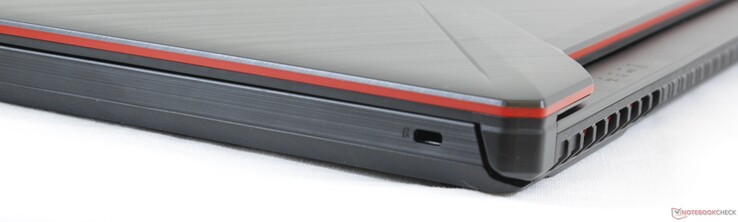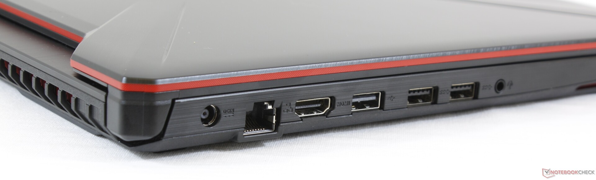 Bis auf den HDMI-Port, der hier ein Upgrade von Version 1.4 auf Version 2.0 genossen hat, sind die verfügbaren Anschlüsse und deren Layout identisch zur FX504-Reihe. Trotzdem sind wir enttäuscht davon, hier keine USB-C-Ports vorzufinden, da diese bei Gaming-Laptops mittlerweile zum Standard gehören sollten. Manche Nutzer werden sich auch darüber wundern, dass sich auf der rechten Seite des Systems keine Anschlüsse befinden. Wie auch bei der Lenovo-Legion-Reihe und dem Razer Blade 15 wurde der SD-Kartenleser wieder einmal weggelassen.