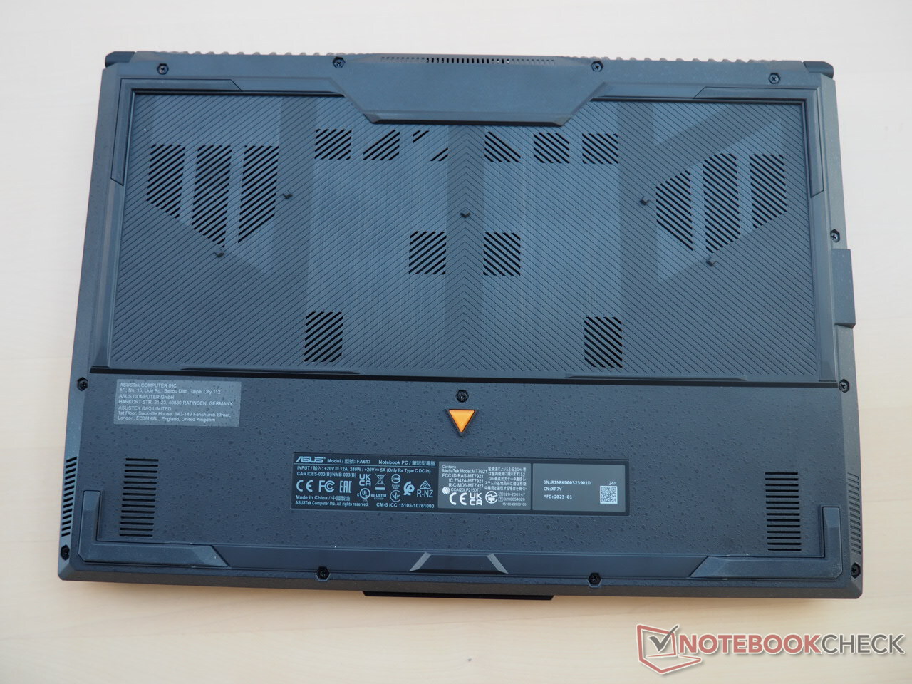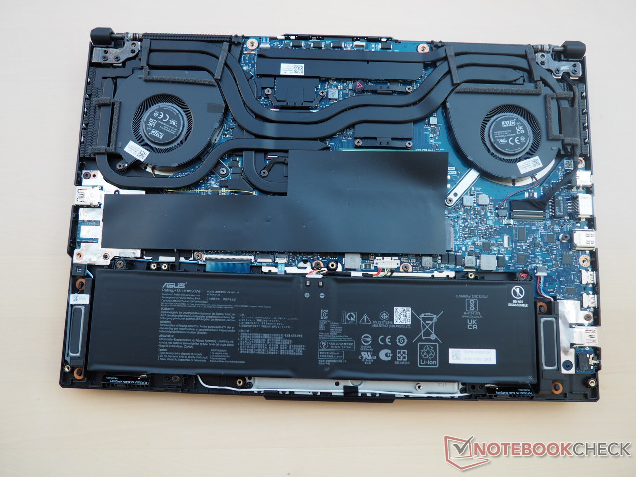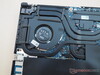 Um an das Innenleben des TUF Gaming A16 zu gelangen, müssen von der Unterseite etwas mehr als 10 Kreuzschrauben entfernt werden. Dann lässt sich die komplette Bodenplatte mit ordentlich Kraftaufwand aus der Verankerung hebeln und gibt den Blick auf fast alle Komponenten frei, wobei sich die SSD und die RAM-Module hinter einer Plastikfolie verbergen (siehe Fotos).