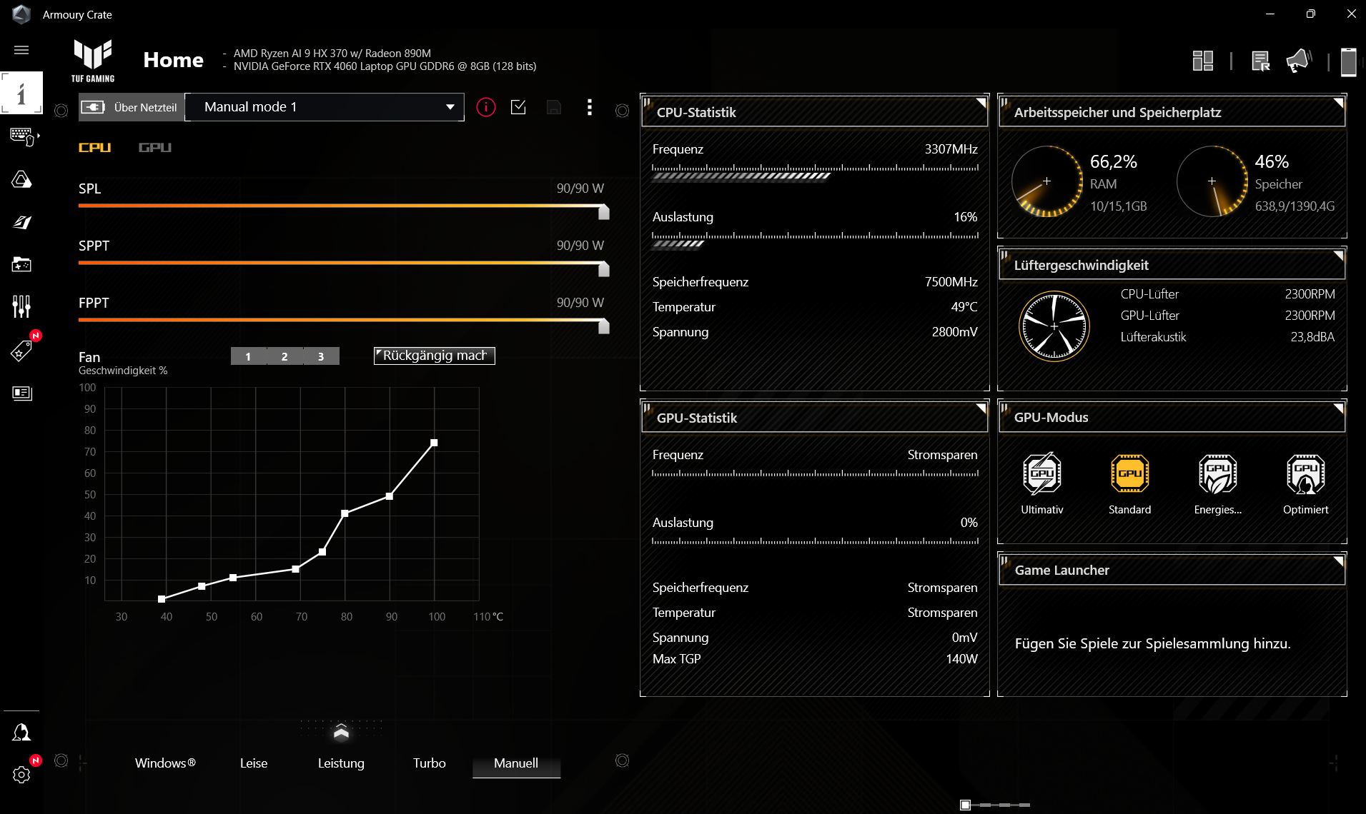 | Asus TUF Gaming A16 FA608WV Ryzen AI 9 HX 370, GeForce RTX 4060 Laptop GPU | Asus TUF Gaming A16 FA617XS R9 7940HS, Radeon RX 7600S | Lenovo Legion Pro 5 16IRX9 G9 i7-14700HX, GeForce RTX 4060 Laptop GPU | Dell G16, i7-13650HX, RTX 4060 i7-13650HX, GeForce RTX 4060 Laptop GPU | HP Victus 16 (2024) i7-14700HX, GeForce RTX 4060 Laptop GPU | Acer Nitro V 16 ANV16-41-R5AT R7 8845HS, GeForce RTX 4060 Laptop GPU | Durchschnitt der Klasse Gaming | |