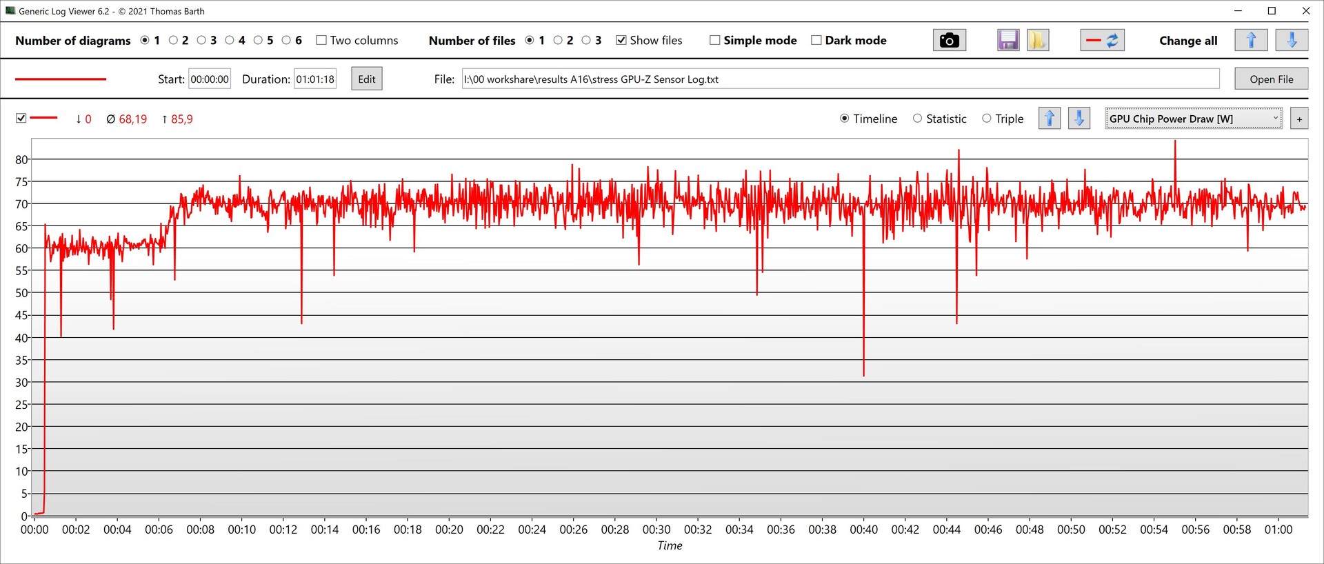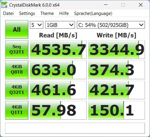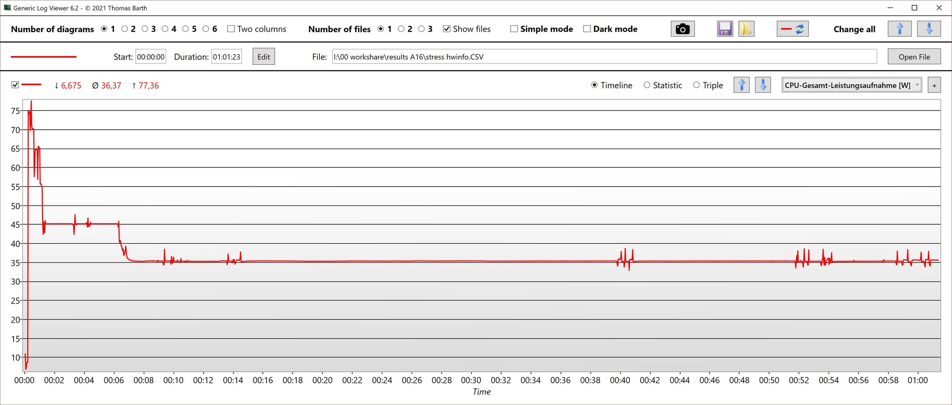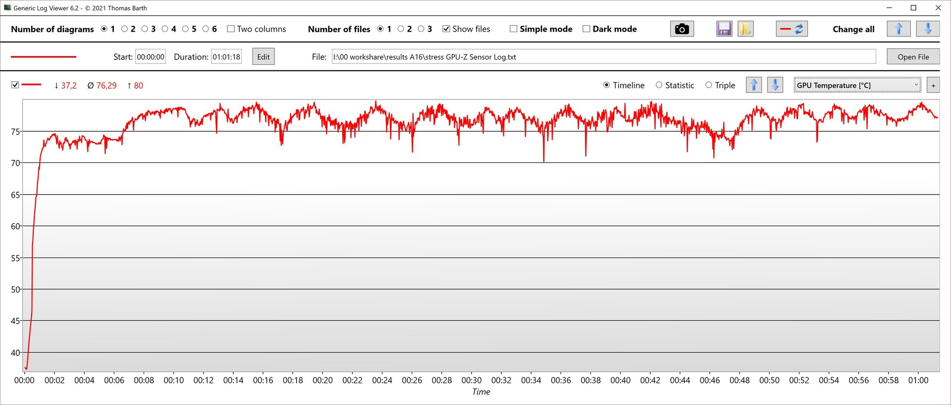 Selbst im Stresstest bleibt das A16 recht kühl, was auch damit zu tun hat, dass die TDP der CPU recht bald von etwa 80 auf dann nur noch konstante 35 W gesenkt wird. Etwas wärmer wird es zentral zum Display hin, Handballenauflagen und auch die WASD-Tasten bleiben kühl bis leicht warm.