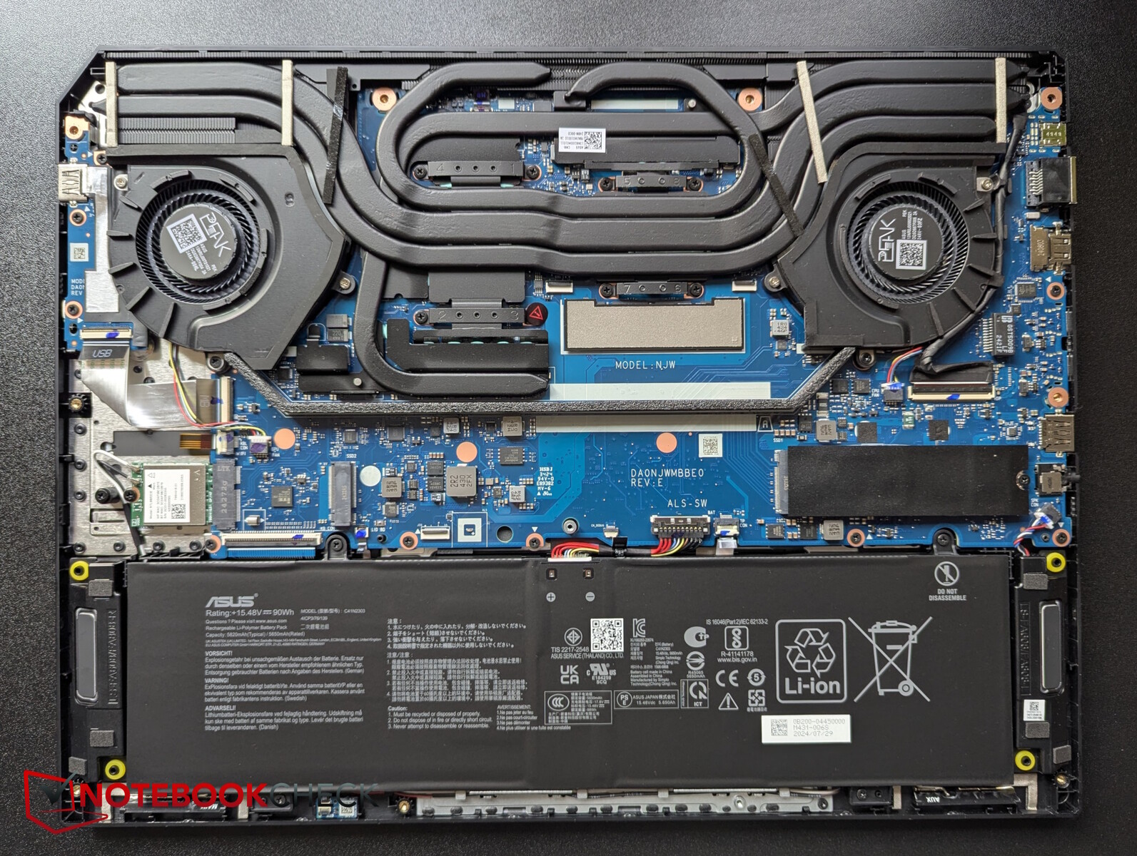 11 Kreuzschrauben in gleich drei unterschiedlichen Längen sichern die Unterseite. Innen gibt es zwei M.2-SSD-Slots und ein austauschbares Wi-Fi-Modul. Vermisst haben wir jedoch eine Upgrademöglichkeit für den Arbeitsspeicher. Dieser ist fest verbaut, eine eher unpraktische Lösung für einen Gaming-Laptop.