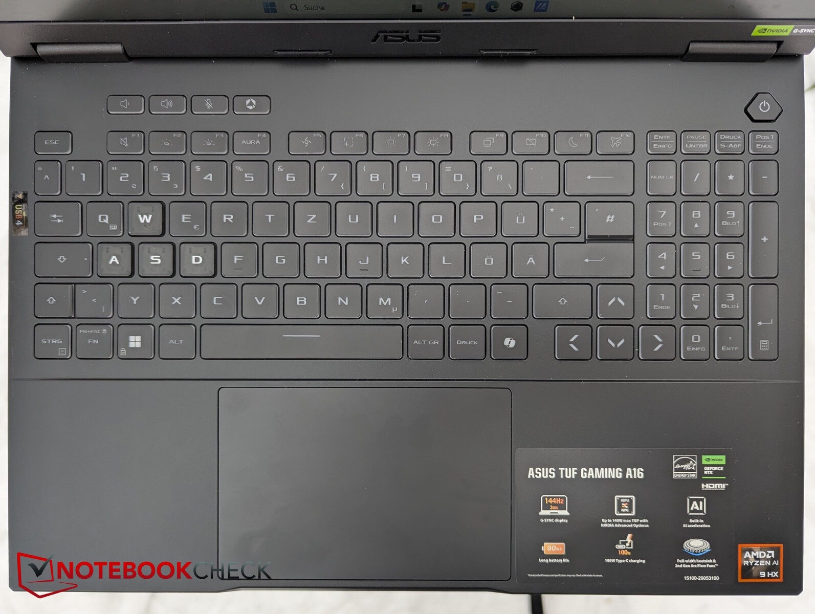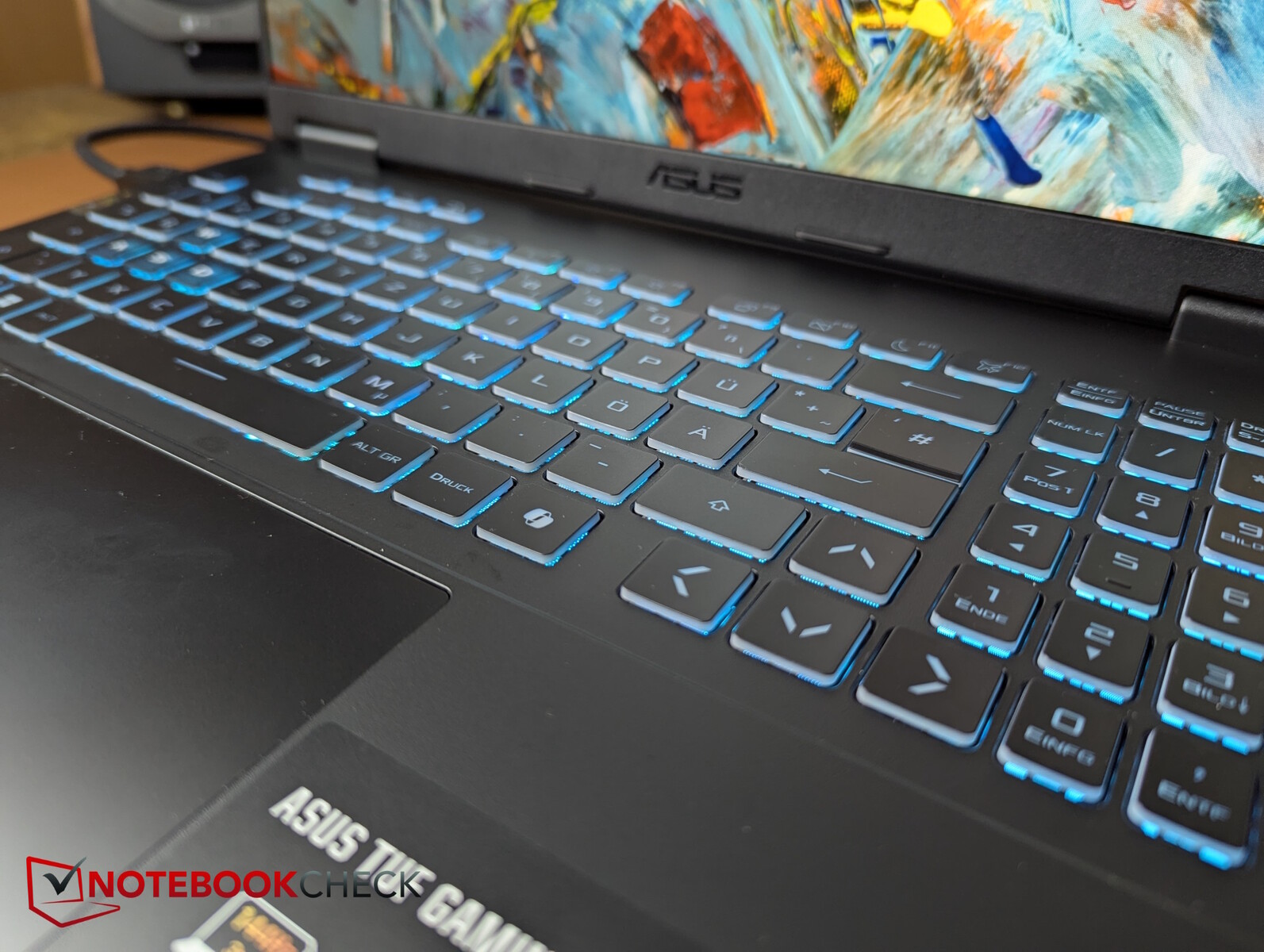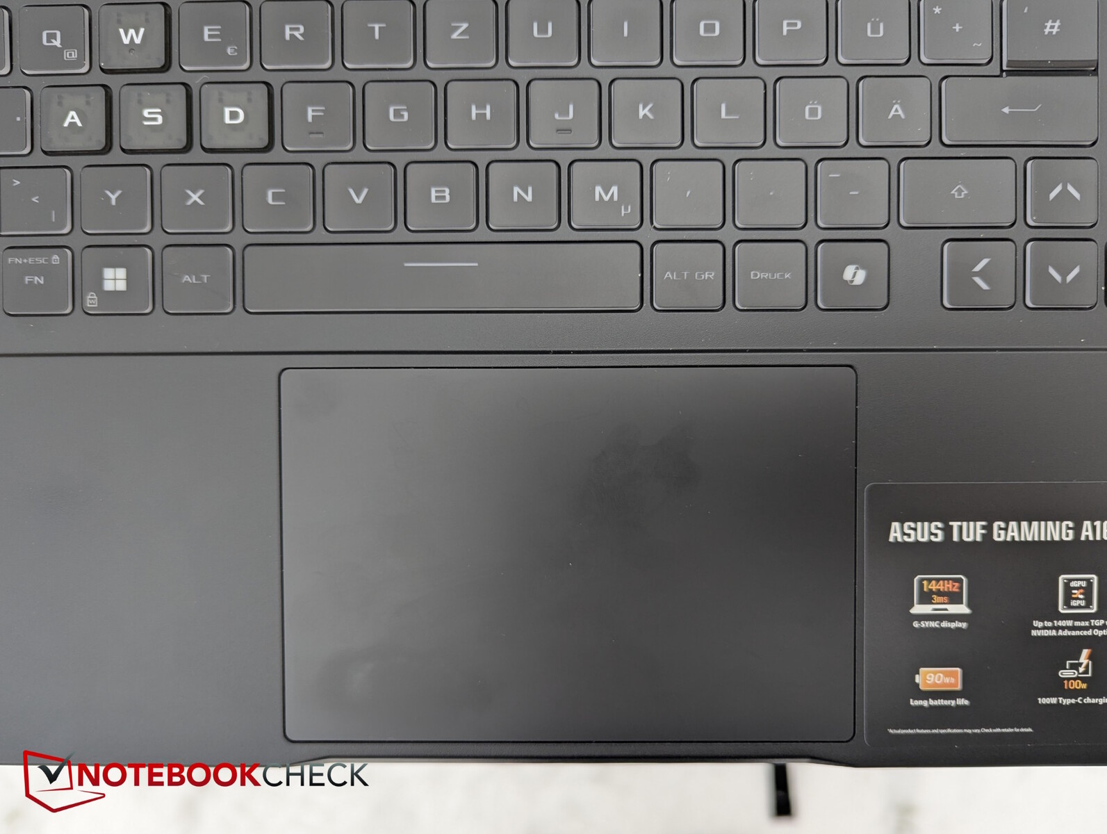 Asus gibt einen Tastenhub von 1,7 mm an, das Feedback ist deutlich spürbar, die Anschlaggeräusche moderat. Wie bei den Asus-Gamern üblich, sind die WASD-Tasten optisch hervorgehoben, die restliche Beschriftung ist mit ihrem dünnen Grau aber etwas zu dunkel geraten, eine einzige RGB-Hintergrundbeleuchtung hilft in lichtschwachen Situationen.