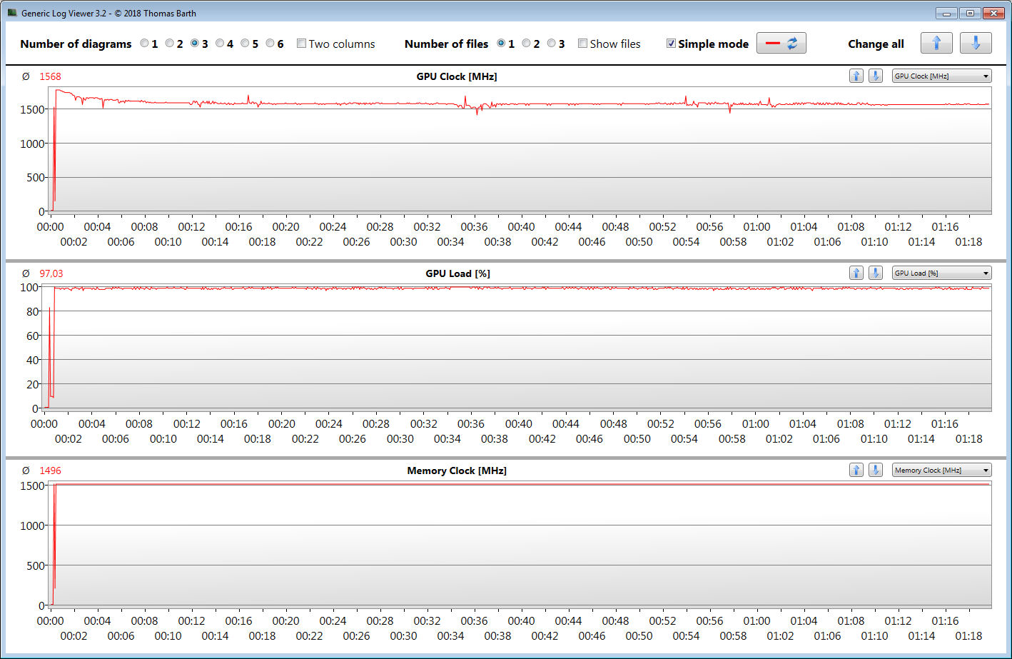Um zu überprüfen, ob die Bildwiederholraten auch über einen längeren Zeitraum weitgehend konstant bleiben, lassen wir das Spiel "The Witcher 3" für etwa 60 Minuten mit Full-HD-Auflösung und maximalen Qualitätseinstellungen laufen. Der vom Spieler verkörperte Charakter wird dabei über den gesamten Zeitraum nicht bewegt. Ein Einbruch der Bildwiederholraten ist nicht festzustellen.