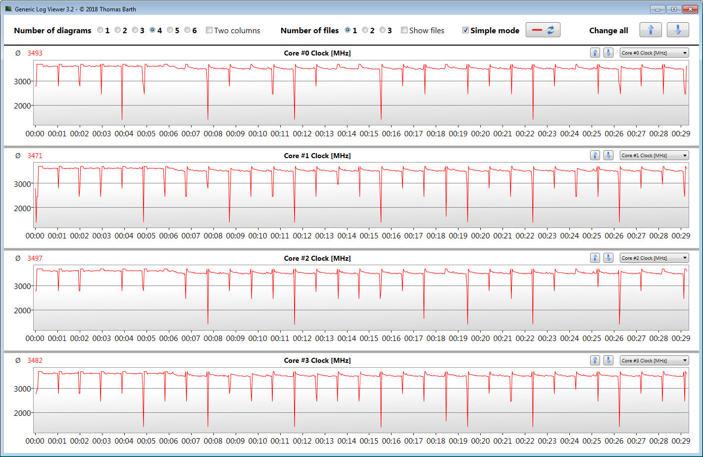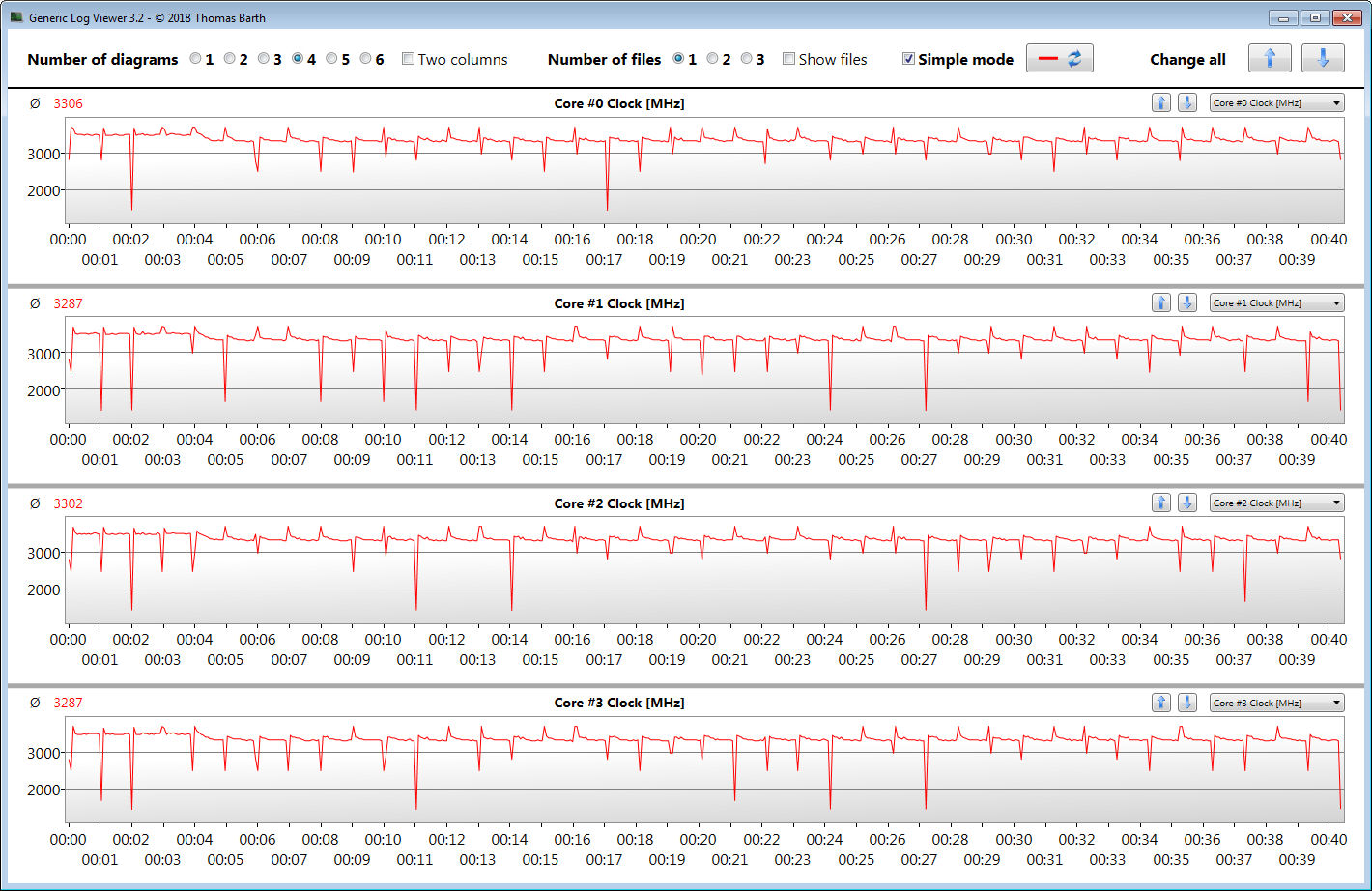 Die Multi-Thread-Tests der Cinebench Benchmarks werden kurzzeitig mit 3,7 GHz durchlaufen. Dann sinkt der Takt auf 3,5 GHz. Die Single-Thread-Tests werden mit 1,6 bis 3,7 GHz bearbeitet. Soweit das Verhalten im Netzbetrieb. Im Akkubetrieb werden die Multi-Thread-Tests anfänglich mit 2,4 GHz bearbeitet. Dann steigt die Geschwindigkeit auf 3,3 bis 3,4 GHz. Die Single-Thread-Tests werden mit 1,4 bis 2,4 GHz beackert.