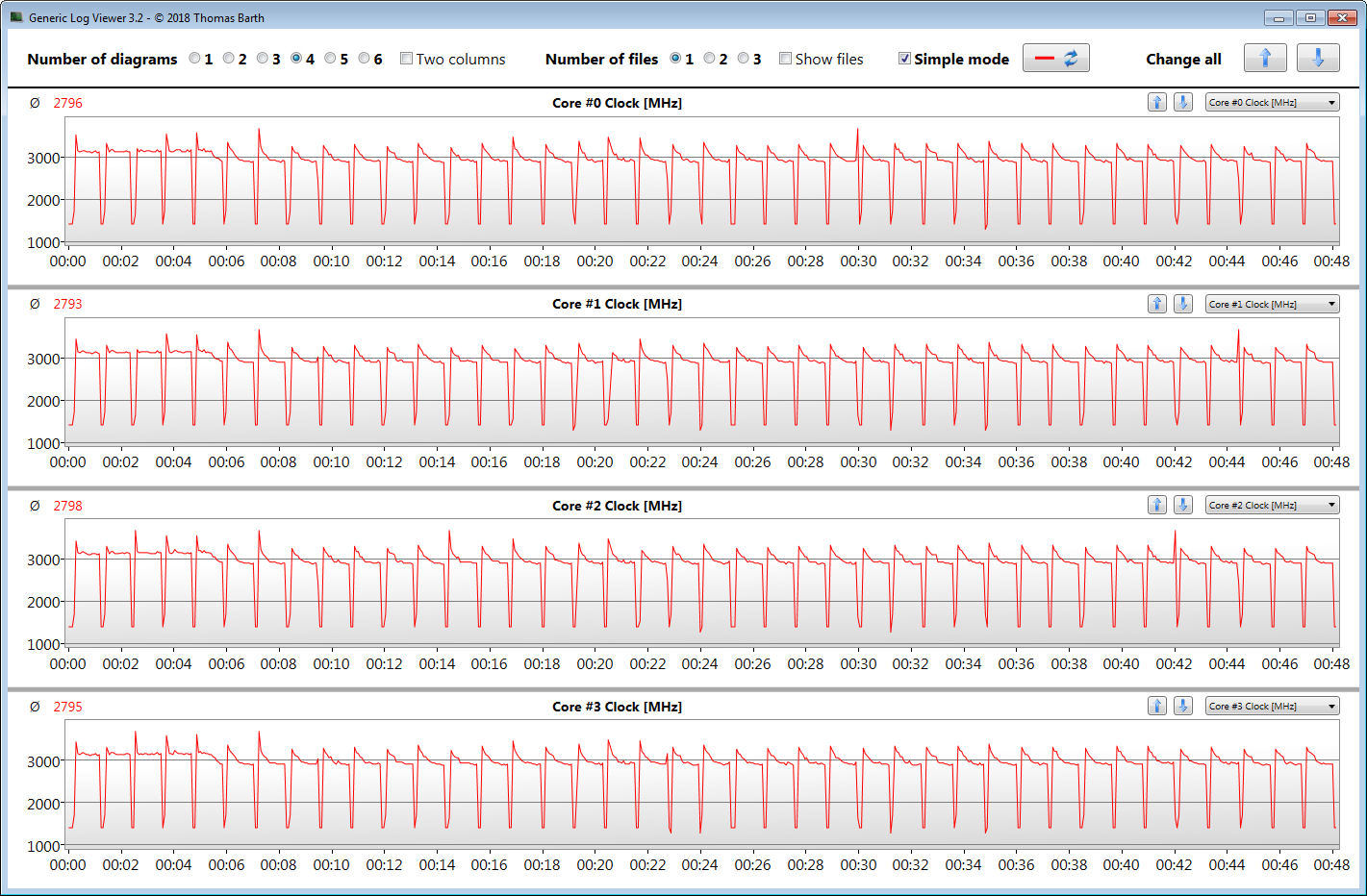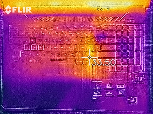 Unseren Stresstest (Prime95 und FurMark laufen für mindestens eine Stunde) durchläuft das Asus TUF Gaming im Netz- und im Akkubetrieb auf leicht unterschiedliche Weisen. Der Prozessor arbeitet für einige Minuten mit 3,3 bis 3,5 GHz, dann wird der Takt auf 2,7 bis 2,9 GHz gesenkt. Das gilt für den Netz- und den Akkubetrieb. Allerdings wird die CPU im Netzbetrieb immer wieder mal auf Geschwindigkeiten jenseits von 3 GHz beschleunigt. Der Grafikkern geht mit 250 bis 350 MHz (Akkubetrieb) bzw. 1.223 MHz (Netzbetrieb) zu Werke.