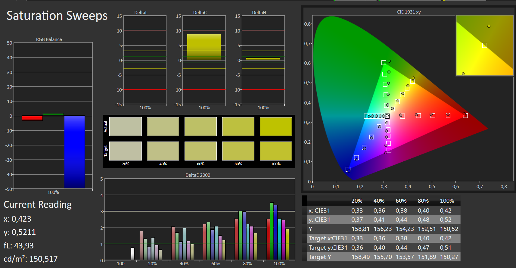 | Farbraum (Prozent von AdobeRGB 1998) (%) | 57 | 57 0% | 58 2% | 55.6 -2% | 56 -2% | 58 2% |