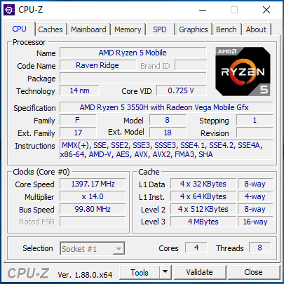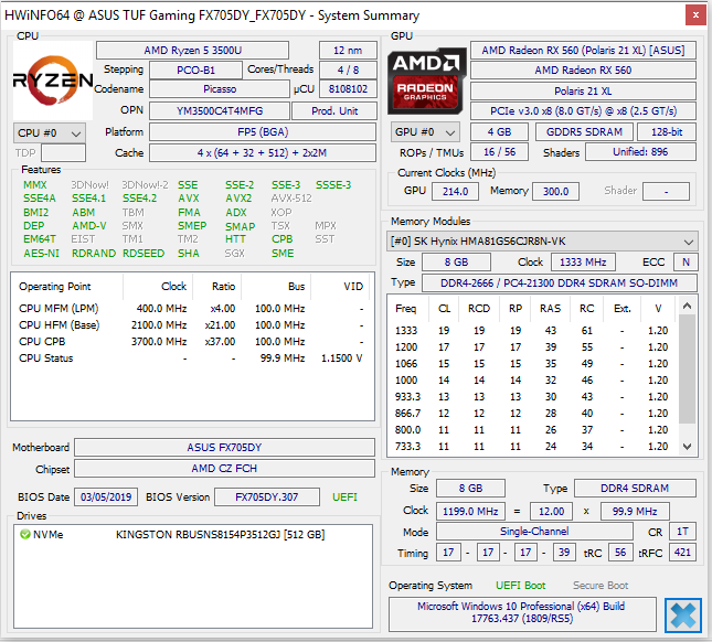 Das FX705DY wird von einer Ryzen 5 3550H (Picasso) APU der Firma AMD angetrieben. Es handelt sich hierbei um eine Mobil-CPU, die über eine TDP von 35 Watt verfügt. Der CPU-Teil der APU besteht aus einem Vierkernprozessor, der mit einer Basisgeschwindigkeit von 2,1 GHz arbeitet. Mittels Turbo ist eine Steigerung auf bis zu 3,7 GHz möglich. Der Prozessor unterstützt Simultaneous Multithreading (pro Kern können zwei Threads bearbeitet werden).